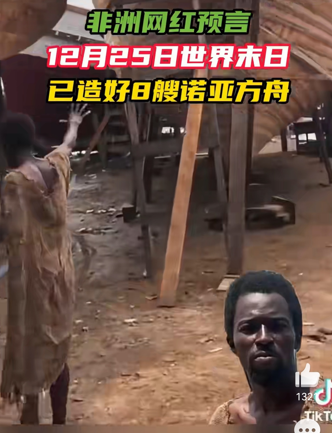 非洲网红预言12月25日是世界末日 你要说是预言家吧…,结果是个网红。上次日本那个预言的漫画家被打脸后,结果也是改口了的。这个非洲网红明天的笑话我都懒得看!据有报道称,他的一些信徒已经变卖所有财产,将钱交给了他,以求登上“诺亚方舟”,这…,怎么感觉有点不太对劲!