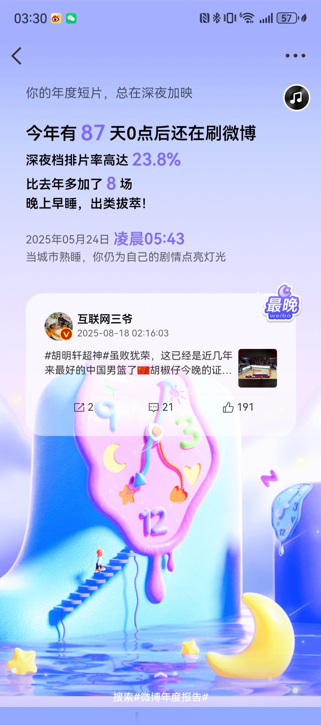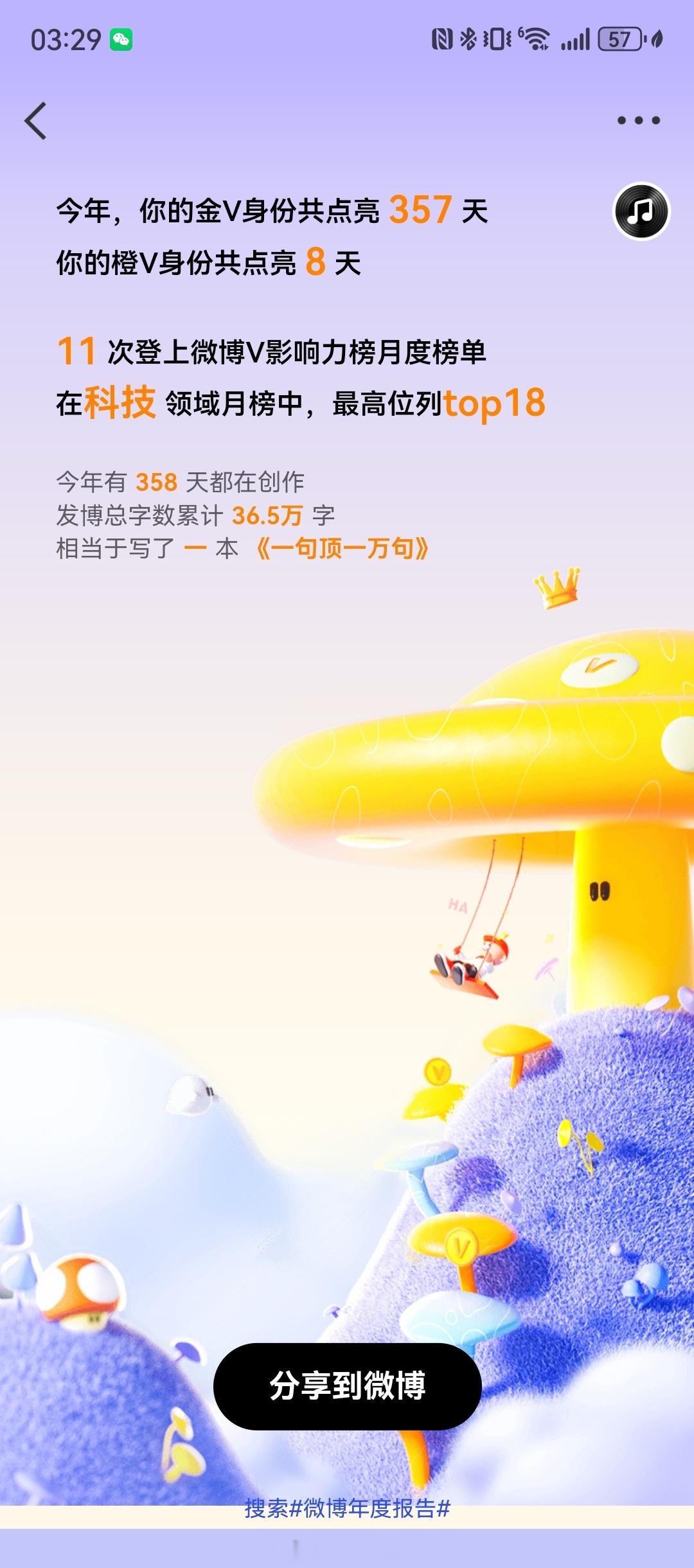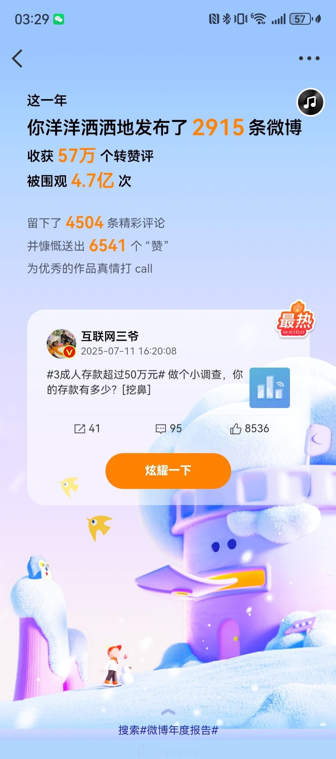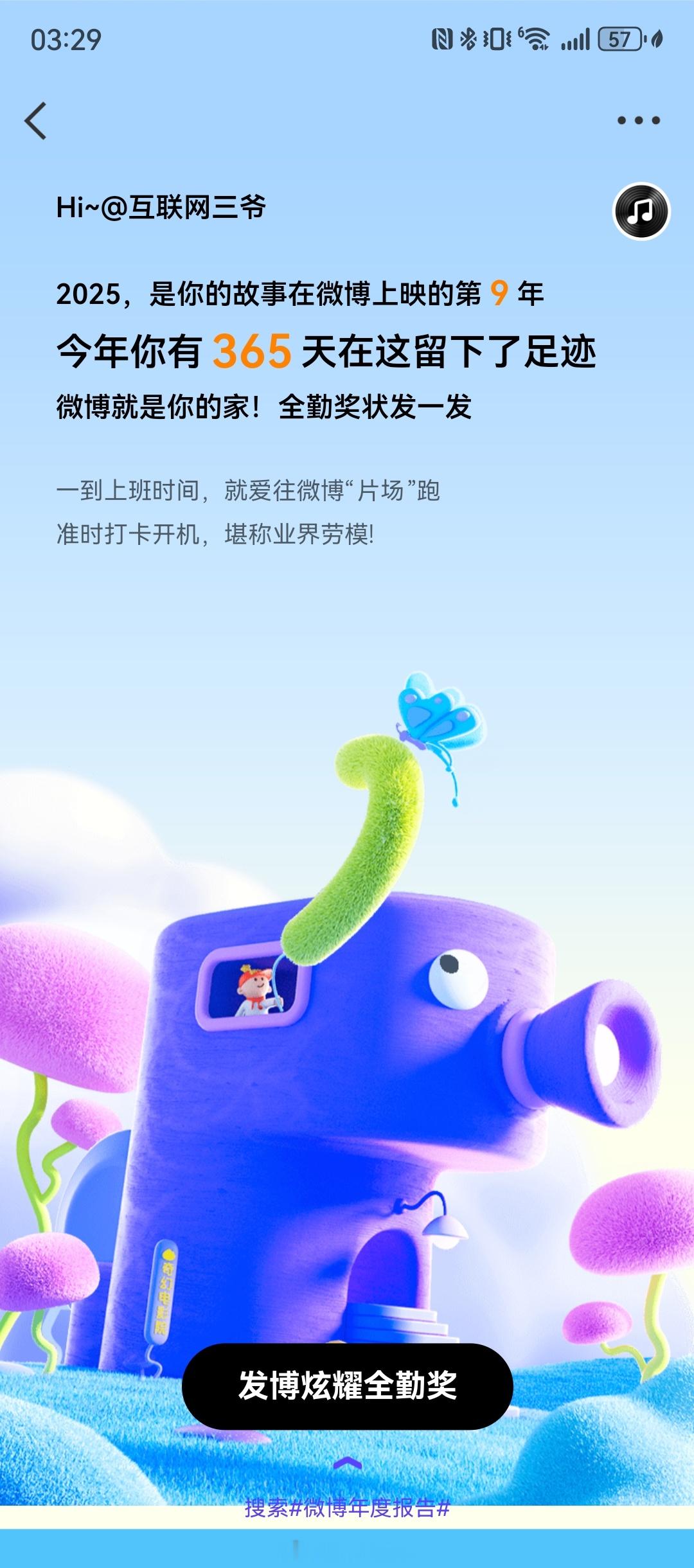 微博年度报告2025,365天全勤,2915条微博,36.5万字、57万互动、4.7亿观看,顺利杀青。