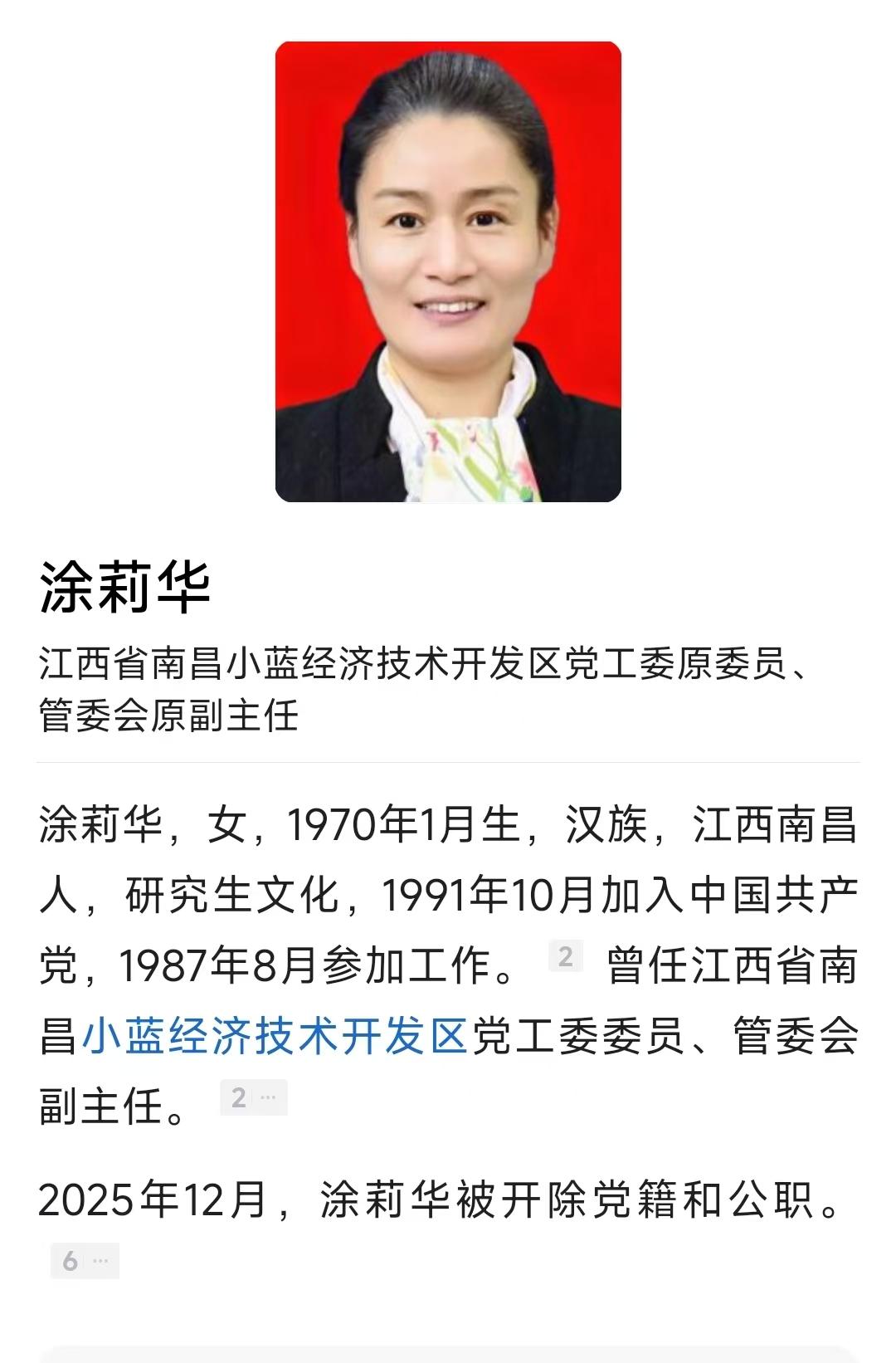 南昌市的涂莉华,今天彻底栽了。 她平日里很注重保养,虽然已经年逾50多岁,但是皮肤状态依旧保养得当,穿着打扮也比较考究,一头秀发,束成马尾,没有一丝的杂乱,身材高挑,看起来也是风韵犹存。 她1970年1月出生于江西南昌,14岁时考上了南昌师范普师专业,经过三年的系统学习,中专毕业之后分配到了南昌市南昌县武阳中心小学任教,教了两年书之后,又进入了南昌县纪委工作,这时候边工作边学习,又自考了南昌大学汉语言文学专业大专班。 于1995年,晋升为共青团南昌市南昌县委副书记,任期6年时间。并且在此期间,在南昌大学自考汉语言文学专业本科班学习。 岁月匆匆,时间来到了2001年,31岁的涂莉华,调往南昌县富山乡,担任乡党委副书记,一年之后,又晋升为南昌市南昌县对外合作局副局长,党组成员。用了一年时间,又从副局长晋升为局长。 2006年时,不仅担任南昌市南昌县对外合作局局长、党组书记。同时还兼着,南昌市小蓝经济开发区党工委副书记,管委会副主任职务。 尤其是在2006年的12月,更是担着南昌县副县长的职务。 此后便一直在南昌县委班子里打转,历任县委常委、统战部部长。 2017年12月,这时候已经卸掉了,身上大部分职务,仅担任南昌小蓝经济开发区管委会副主任一职。 其实她早在今年8月份,就已经东窗事发,官宣落马。 没想到调查的结果还是极为迅速,4个月的今天,也已经将她的问题查清楚了。 可以看到,她在履职期间,真是一点好事不干,不光廉洁底线失守,而且以权谋私,大搞权钱交易,利用职务上的便利,在企业经营、工程承揽、工程款拨付等方面为他人谋取利益,非法收受巨额财物。 通报中既然用了巨额一词,那就说明,这女人贪婪之心,欲壑难填! 如今在55岁的年纪,原来被双开的命运,然后进入牢狱之中,纵使流下悔恨的泪水,那必然也是鳄鱼的眼泪,博不了一点同情! 她曾经的所作所为,就已经为如今的结局,提前画上了句号。 从小学老师再到当地要员,一路顺风顺水,扶摇直上,如今马失前蹄,坠落深渊,可谓是 投机取巧换前程,因果相报坠深渊。 虚虚实实终是虚,真真假假难成真。