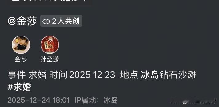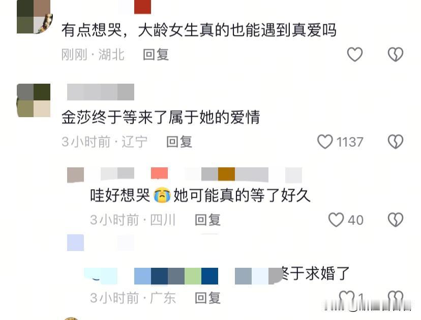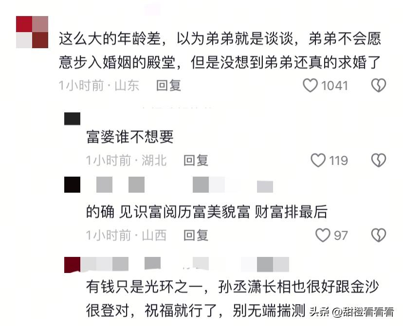 真没想到金莎被小男友求婚了,两个人相差17岁,本想着也就谈谈而已,毕竟男朋友当时还是个刚毕业的学生,也许另有想法也不一定,只是没想到,这么多年两个人的感情居然有结果了。 12月23日,孙丞潇居然真求婚了,两个人相拥的那一刻,满满的都是网友的祝福和感动,有人都感动的想哭了,没想到金莎终于等来了她的幸福,大龄女生也能遇到真爱。
