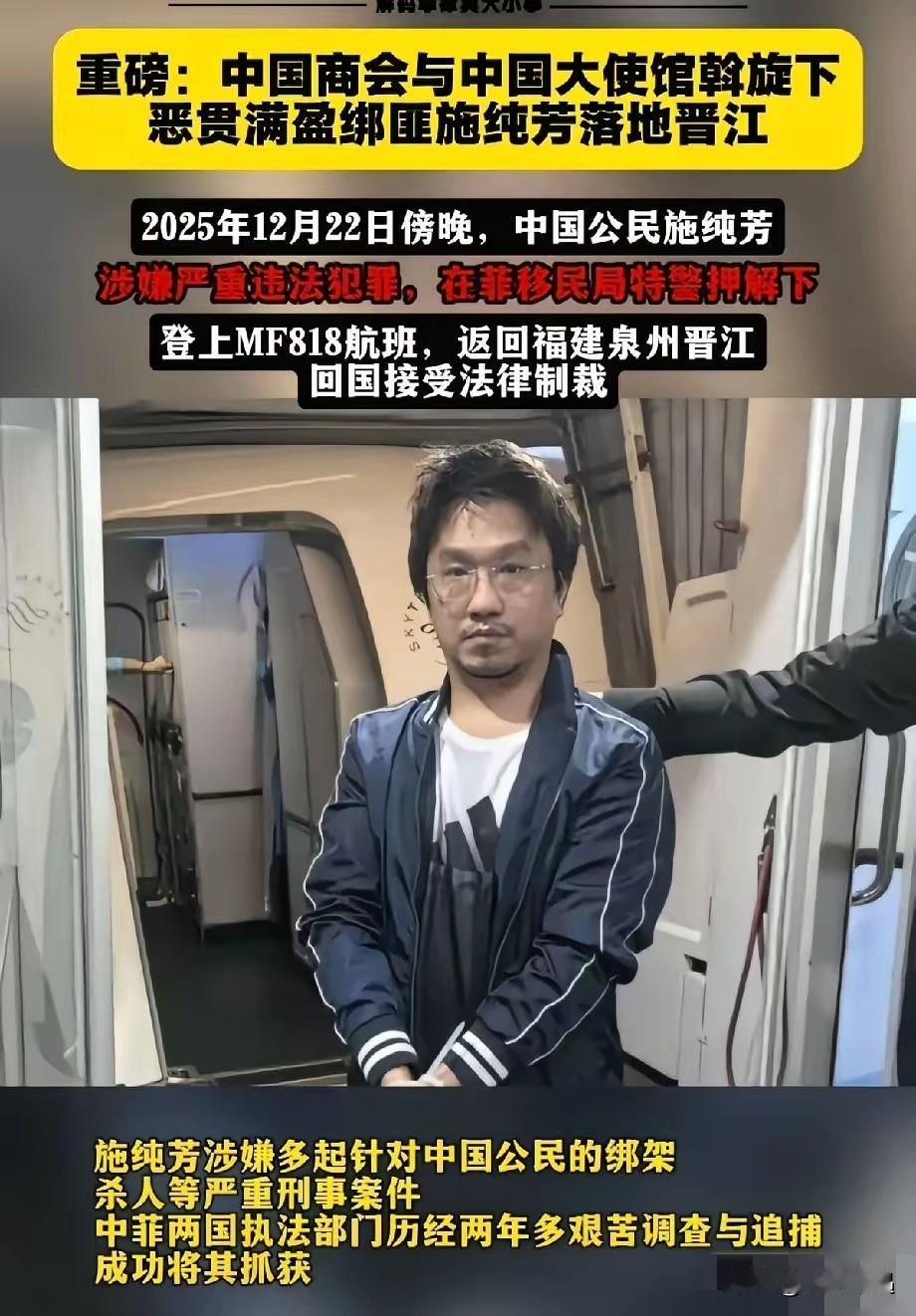 谁能料到,名字温婉、戴着眼镜看似文弱的施纯芳,竟是畜生不如,丧心病狂的恶徒。 他蛰伏菲律宾,把黑手伸向同胞,绑架勒索、人口贩卖、制毒洗钱,桩桩恶行沾满鲜血。拿到天价赎金后,他竟毫无人性地撕票,五条以上鲜活的生命就此陨落,多少家庭被他搅得支离破碎。 中菲警方跨越两年联手追缉,终于将这丧心病狂的败类押解回国。他犯下的滔天罪行,岂会是一命抵一命就能还清的?这种泯灭良知的渣滓,必须让法律亮出最锋利的刀,才能告慰那些惨死的冤魂。 各位读者你们怎么看?欢迎在评论区讨论。