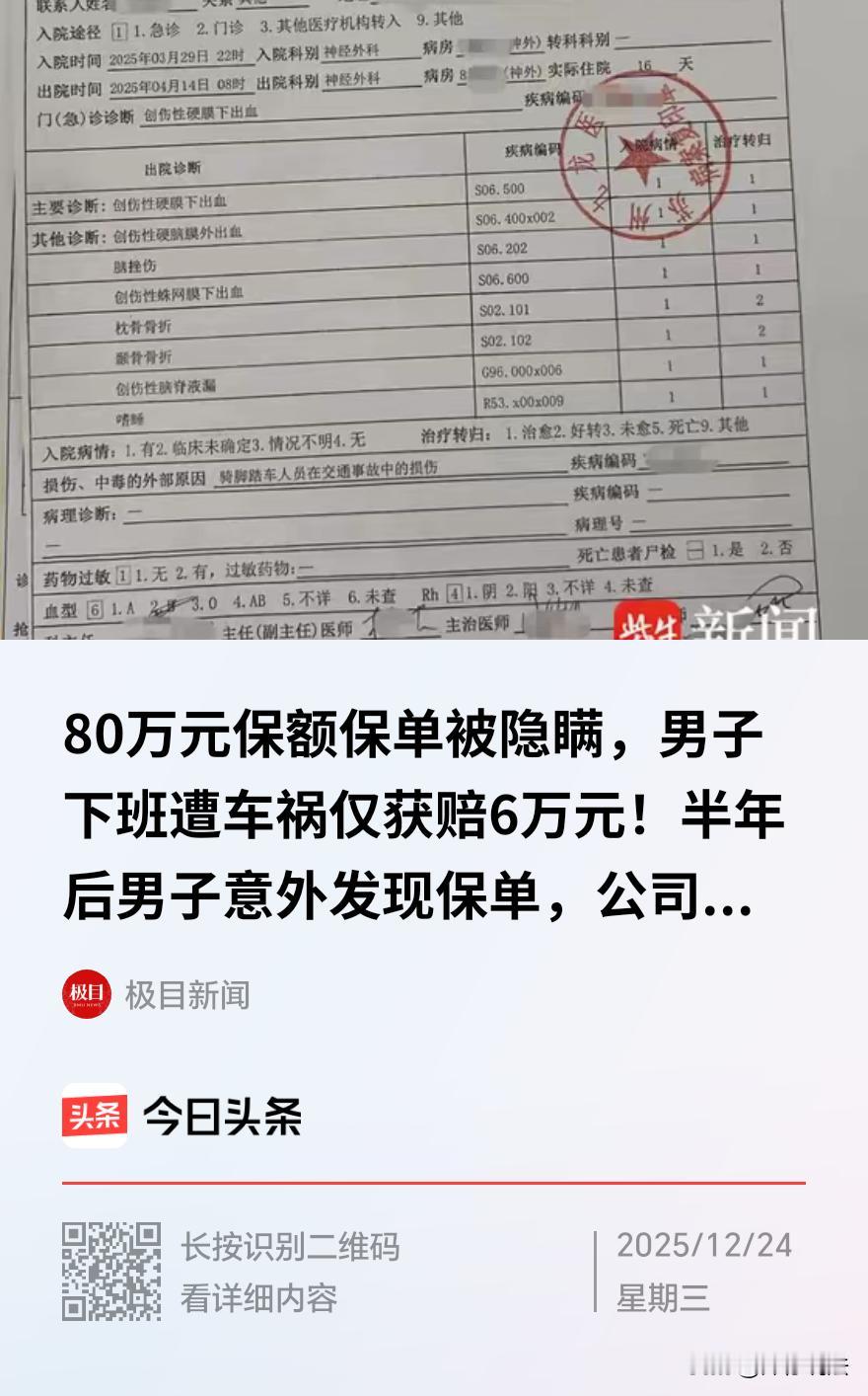 江苏苏州,一男子下班路上被车撞成颅骨骨折,公司老板带着6万元现金和厚厚一摞文件来到病房:“签字拿钱,别去鉴定,档案里留下残疾记录这辈子就完了。”男子信以为真,颤抖着手签下“一次性了断”协议。半年后,男子在劳动能力鉴定机构偶然瞥见文件上自己的名字,旁边竟写着“80万团体意外险”。男子顺着线索查下去,赫然发现自己每月工资扣的保费,买的是一份高额保单,而公司正试图用他签过的授权书悄悄领走保险公司的16万理赔款。对峙时,老板扔出第二份协议:“想拿钱?先写张欠条,把公司‘垫’的六万六还回来。”如今,保险金冻在账户里,男子握着转账记录和欠条,公司拿着“自愿和解”协议僵持不下。   小张(化名)是一名普通的日结工人,每天早出晚归,靠体力活挣取生活费。   2025年3月,小张在一家建筑公司找到了一份相对稳定的工作,入职时,公司给小张买了保险,每个月从工资中扣除的几十元保险费项目。   2025年3月29日傍晚,小张结束了一天的工作,骑着电动车回家,遭遇车祸,对方全责。   小张被送医治疗,诊断枕骨骨折、蛛网膜下腔出血。   住院期间,小张想起了公司承诺的保险,他给公司负责人打了电话:“老板,我出车祸了,在医院,公司不是给我买了保险吗?这个怎么理赔?”   电话那头,老板安慰了几句,表示会处理,但接下来的日子里,公司始终没有人来医院探望。   几天后,老板在电话里委婉地说:“小张啊,你先好好养伤,公司现在活儿不多,你伤好了也不用急着回来上班。”   出院后,小张开始着手处理保险理赔,联系了公司之前介绍过的保险业务员,想要保险单号,了解具体的理赔条款和流程。   几次询问,对方总是以各种理由推脱,还让找公司。   小张找到了公司老板,这次,老板的说法变了:“小张啊,你可能记错了,公司给你买的不是人身意外险,是雇主责任险,主要是保公司风险的。”   2025年4月25日,公司老板将小张叫到办公室,同意赔偿6万元,一次性解决。   老板特意强调:“我劝你别去做伤残鉴定了,做了鉴定,档案里就永远记录你是残疾人了,以后找工作都受影响。”   小张急需用钱,在老板的催促下,他没细看文件内容,就在《一次性赔偿协议书》上签了字。   小张根本不知道文件中还夹着一份“委托代领理赔款”的授权书。   签完协议后,小张带着6万元回到老家养病,半年时间,身体渐渐康复。   2025年10月,公司突然联系小张:“你的劳动能力鉴定时间到了,公司已经交了鉴定费,你过来做一下鉴定。”   在鉴定机构,小张偶然看到工作人员桌上的文件,赫然发现自己的名字旁边写着“团体意外伤害险”几个字。   他心里一紧:老板不是说买的是雇主责任险吗?   离开鉴定机构后,小张开始四处打听,得知自己的保险不是雇主责任险,而是一份保额80万元的团体意外伤害险,被保险人是小张本人,受益人也应该是他。   小张这才意识到公司骗人,80万的保额,公司却只赔了他6万,还想偷偷领走保险公司的理赔款。   发现真相后,小张立即联系了保险公司业务员,对方匆匆挂断电话,随后将小张的联系方式拉黑。   小张又找到公司老板对质,老板换了一套说辞:“保险只能赔一次,公司已经赔了你6万,你要是想要保险理赔,就把6万退回来,自己去找保险公司。”   小张没有退缩,立即致电保险公司,要求撤销这份未经他本人同意的理赔申请。   经保险公司核实,小张的核定赔付金额为161,600元。   得知保险理赔金额后,公司老板主动联系小张协商。   2025年12月2日,在老板的催促下,小张又签了一份《协议书》和一份“欠条”。   签完协议后,小张觉得自己像被牵着鼻子走,但为了拿到钱,还是选择了签字。   2025年12月5日,小张从公司额外拿到95,400元。   钱到账了,小张心里却越来越不是滋味,咨询律师后得知,除了保险理赔,他还有权申请工伤赔偿。   思前想后,小张再次向保险公司提出撤销理赔流程,而那笔161,600元的保险理赔款被冻结在保险公司账户中,双方陷入僵局。   目前,小张准备诉讼维权。   《保险法》第39条第2款的规定,保人指定受益人时须经被保险人同意。投保人为与其有劳动关系的劳动者投保人身保险,不得指定被保险人及其近亲属以外的人为受益人。   《工伤保险条例》第十四条规定,职工有下列情形之一的,应当认定为工伤:……(六)在上下班途中,受到非本人主要责任的交通事故或者城市轨道交通、客运轮渡、火车事故伤害的;……   本案中,工伤保险赔偿与团体意外险赔偿属于不同的法律关系,二者并不冲突,小张可以兼得工伤保险金和商业保险赔偿金。   小张系下班路上遭遇车祸,且对方全责,符合工伤情形,确实可以在保险赔偿之外继续主张工伤赔偿。   不过,小张要尽快去申请工伤认定,避免过了1年有效期。   对此,您怎么看?