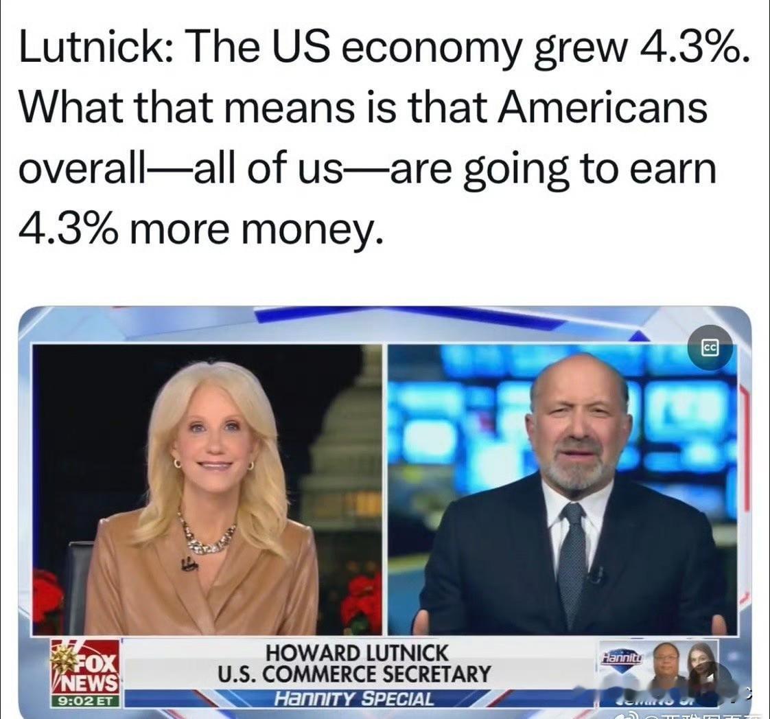 商务部长:美国经济增长4.3%,意味着所有美国人收入增加4.3%…兜里钱多了,所