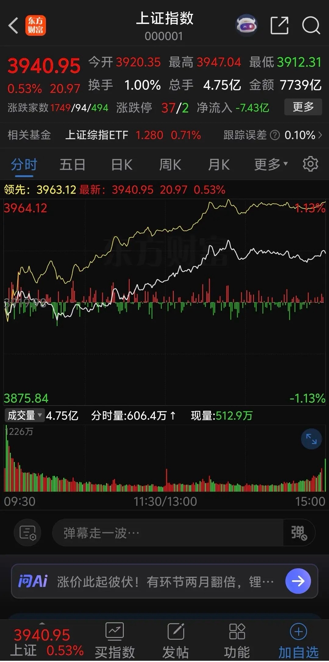 大盘强的让人怀疑,早盘开盘跳水后又迅速拉起来,然后震荡一段时间后又跳水下跌,很多股民感觉这一波反弹可能结束,但是万万没想到震荡一段时间后又拉升上涨,而且今天直逼3950关口创反弹新高,均线上全部修复,86家股票涨停,4128家股票上涨,越来越觉得前一段时间下跌是挖坑行情,现在已经被修复,现在直接6连阳,继续上涨突破4000点关口概率越来越大,到时候4000点后真的是新的时代开始。