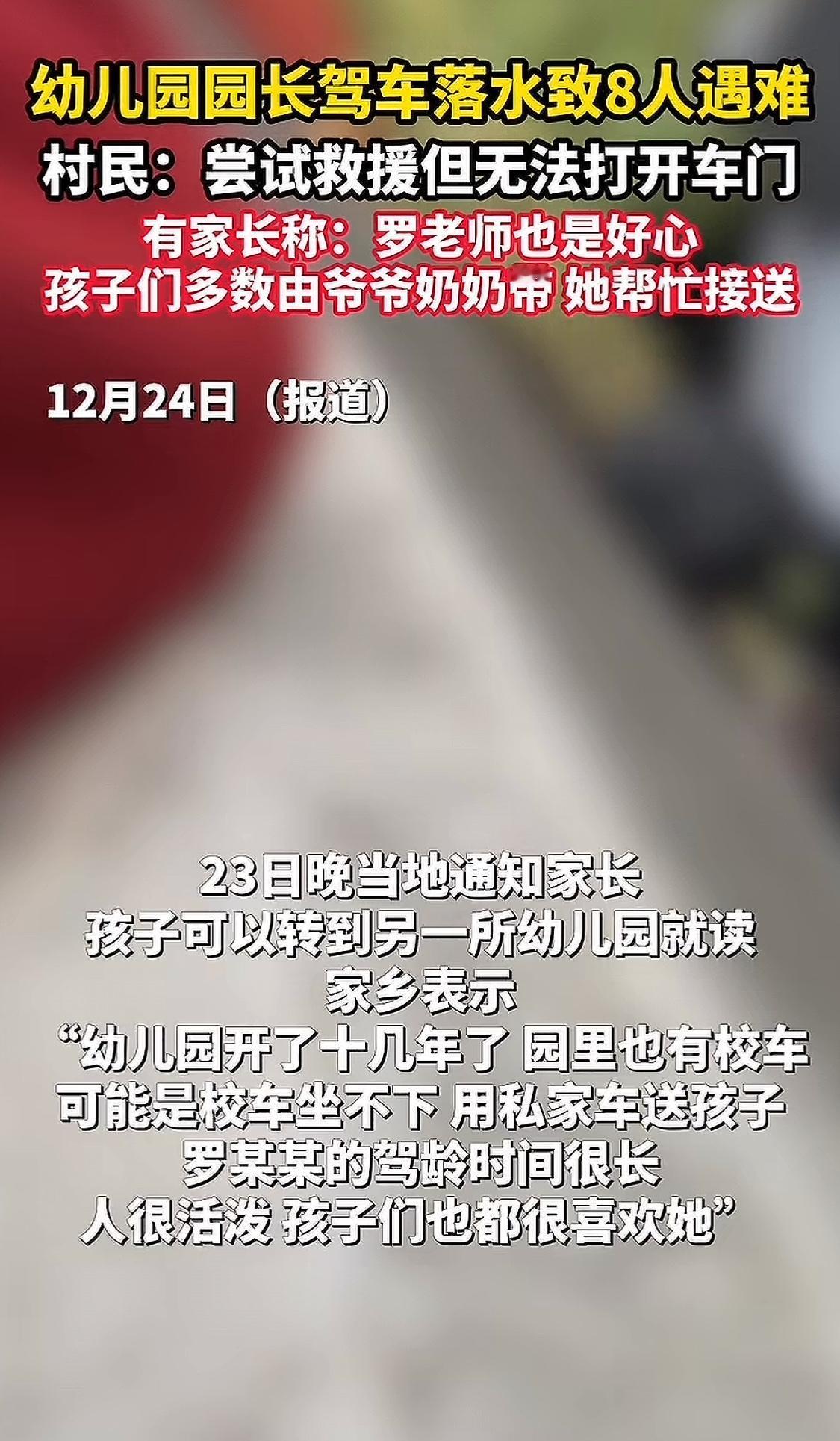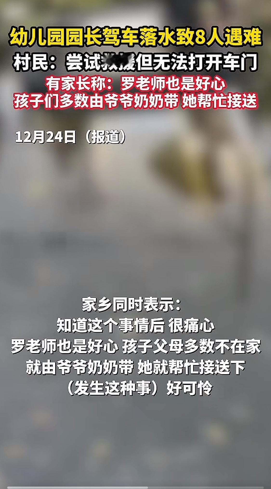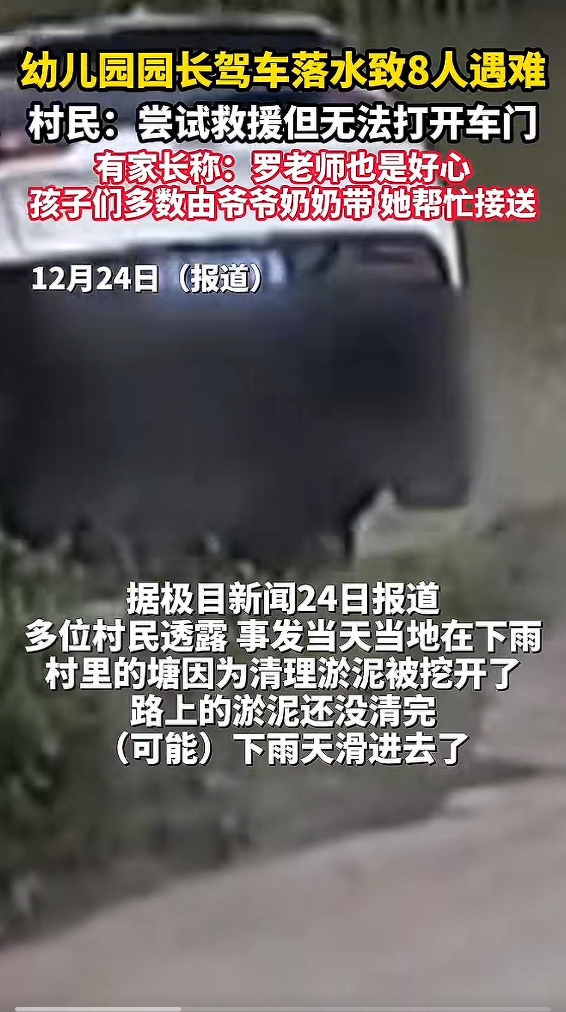 年关将至,悲剧再次传来,九江一辆SUV坠入池塘,车内的7名儿童和一名司机全部溺亡,据悉司机的女儿也在其中,令人痛心! 此事发生于12月23日16点的江西彭泽县,涉事的驾驶员罗某某今年49岁,是当地一所幼儿园的园长,事发时,正是幼儿园放学期间,由于校车载不下那么多人,园长决定驾驶自己的私家车将6名留守儿童送回家。 不料,车子行驶至一处池塘时,意外发生了。 据悉,这个池塘当天正在清淤,路上有淤泥,再加上下雨车子打滑不慎坠入池塘,当时也有热心人下池塘救人,无奈车门打不开,很快就沉入了水底,不敢想,当时车里的孩子有多绝望。 有知情者透露,园长人很好,她的女儿也在里面,她用自己的私家车送学生回家,不是第一次了,可没想到这次却发生了这样让人始料未及的事。 目前失去孩子的家长悲痛欲绝,园长去世,园长老公已被控制,幼儿园方面也表示,其他孩子可以转学。