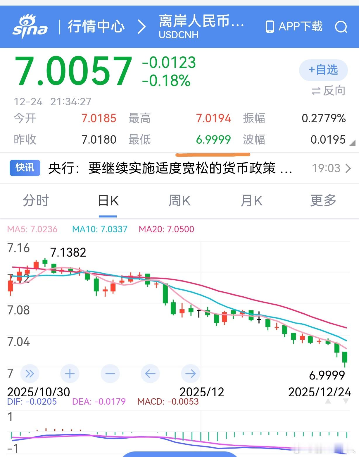 人民币对美元汇率破7来得真快啊,今天离岸人民币盘中破7元,进入6.9999,不过很快就被收回。看来新年前可能要进入6字头了。