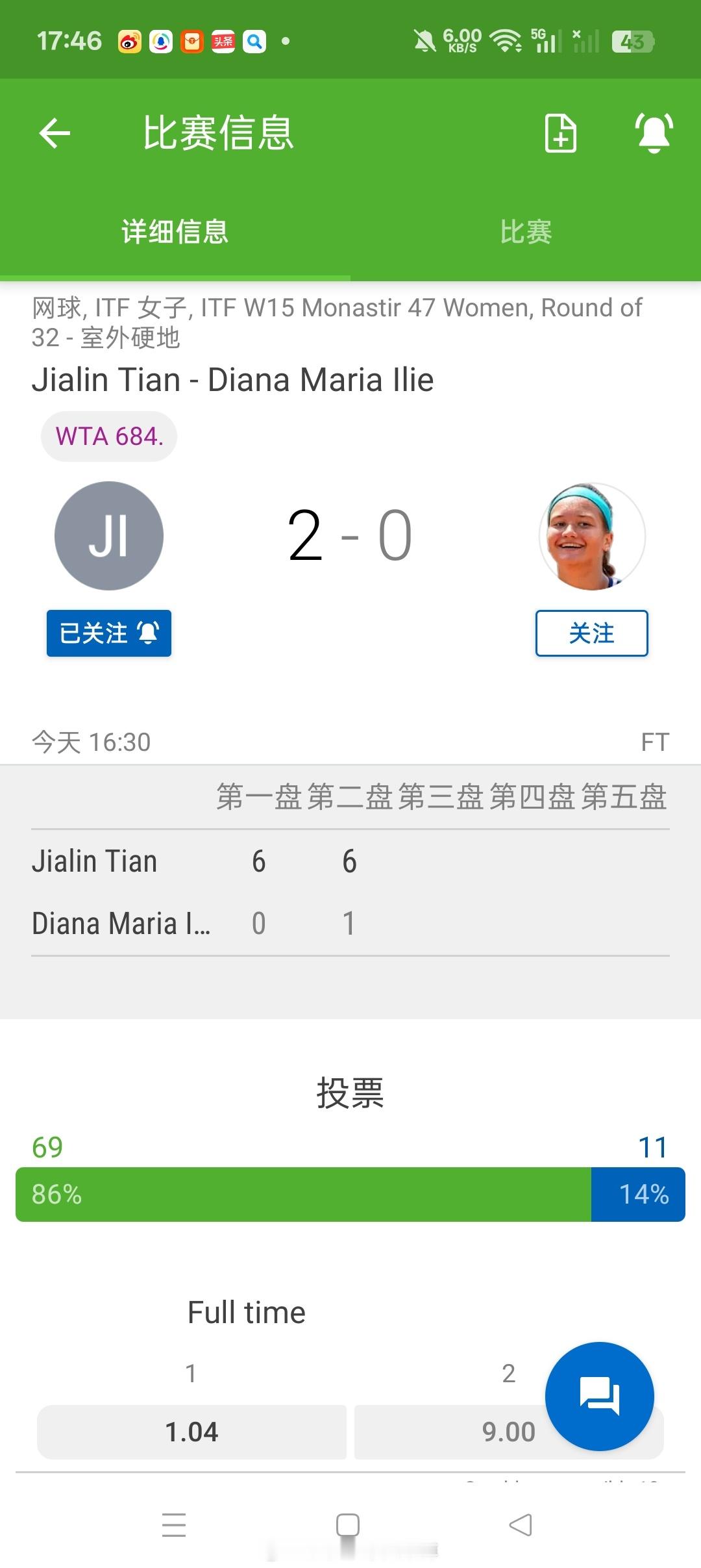 小花小草资讯 【莫斯纳提尔W15】女单首轮3号种子🇨🇳田嘉琳6-0/6-1横扫资格赛突围的🇷🇴球员Llie晋级第二轮田嘉琳收获1 分
