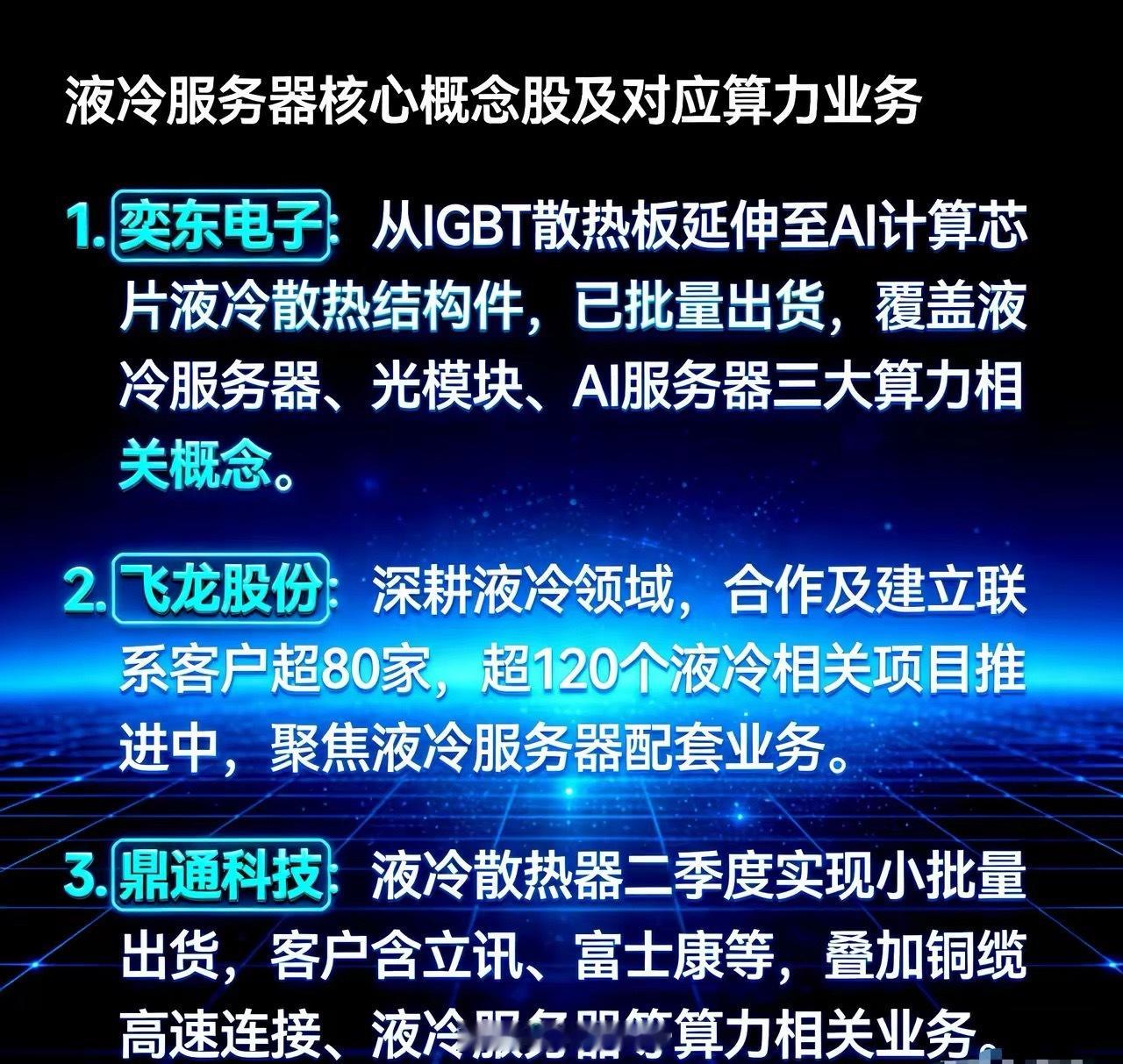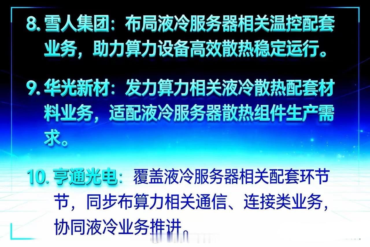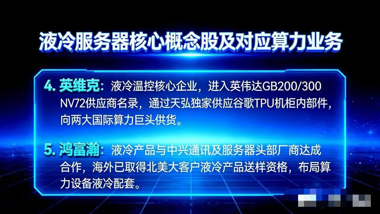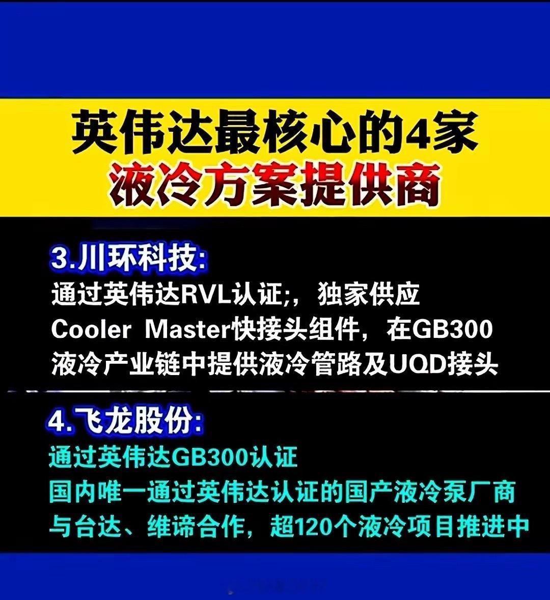 仅有4家,供货英伟达的A股液冷服务器领域龙头。第一家,英维克,英伟达GB300机柜及液冷方案独家供应商,公司通过了英伟达、谷歌、英特尔三大巨头液冷技术认证。第二家,飞龙股份,该公司通过了英伟达gb300认证,是当前国内唯一通过英伟达认证的国产液冷泵生产商。第三家,川环科技,这家公司通过英伟达rvl认证,独家供应coolermaster快接头组件。第四家,高澜股份,该公司通过了英伟达gb200/gb300认证,独家供应英伟达h100/gb300液冷模块。