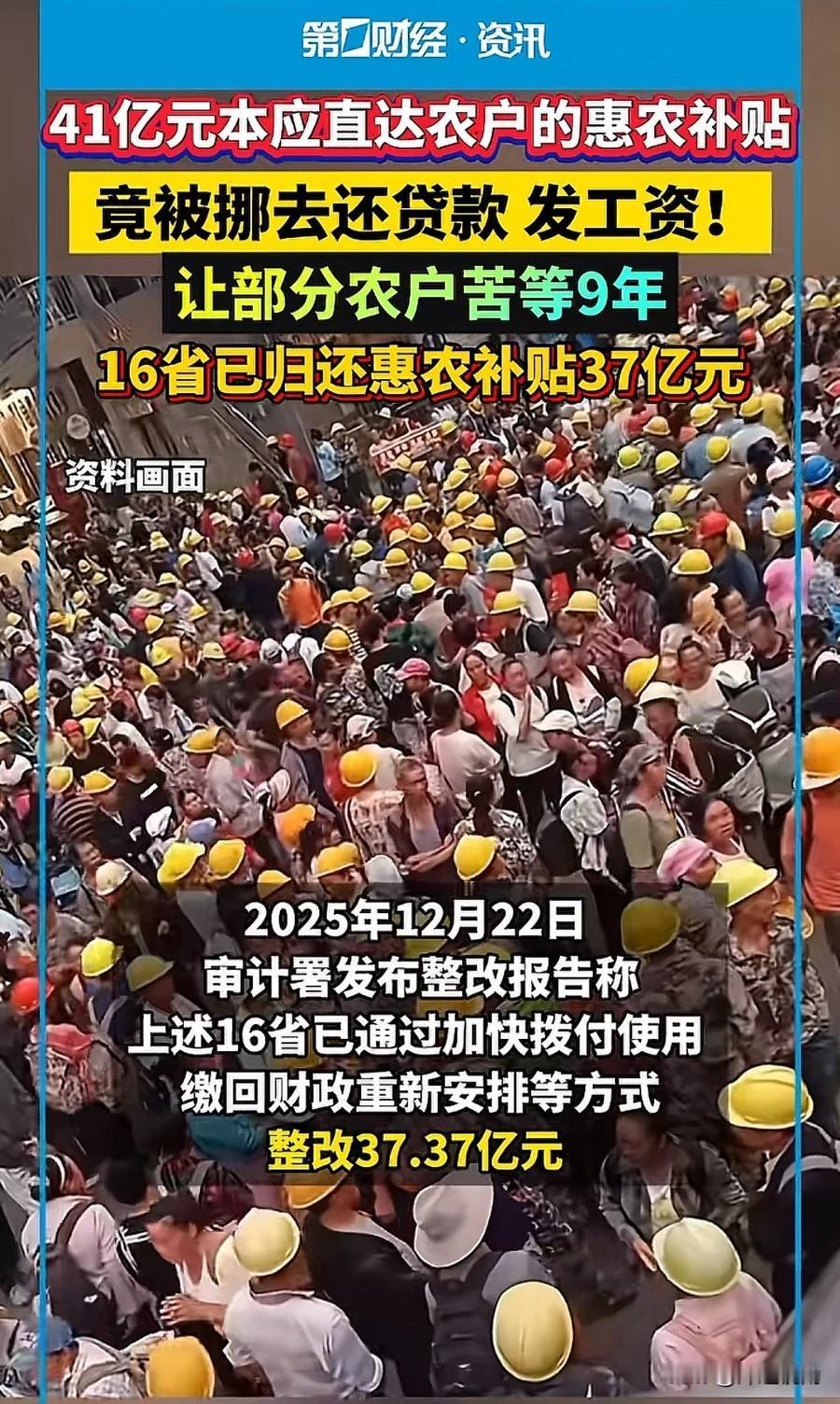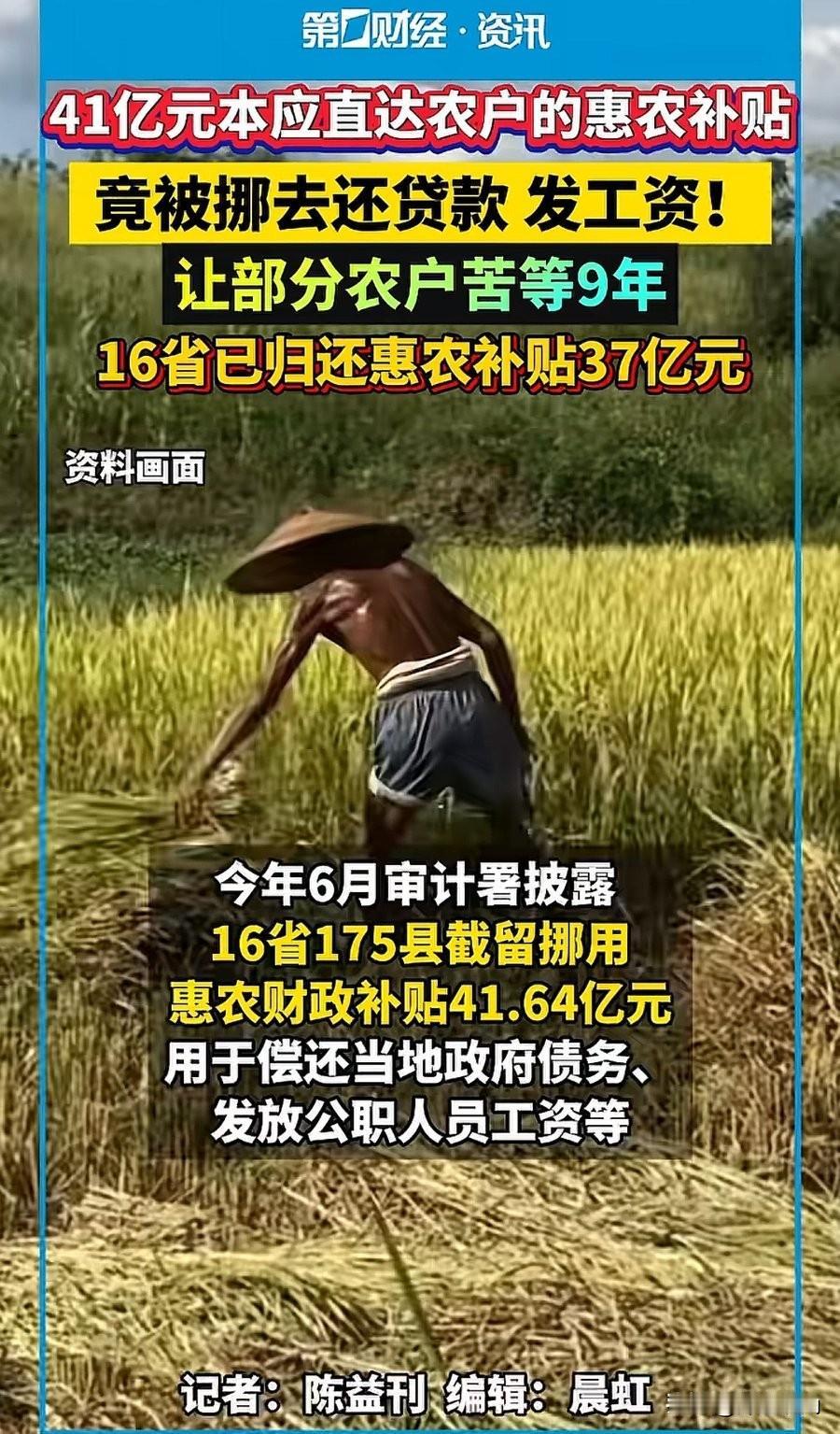 本该直达农户的41.64亿元惠农补贴,却被16省175县挪去还贷款、发工资,部分农户苦等补贴长达9年。这则由审计署披露的消息,撕开了惠农资金监管的一道口子。 今年6月,审计署曝光16省175县截留挪用惠农财政补贴41.64亿元,这些钱本应是农户的“春耕钱”“增收款”,却被用于偿还当地政府债务、发放公职人员工资。更扎心的是,拖欠农户补贴资金的时间,平均1年,最长达9年。 2025年12月22日,审计署发布整改报告称,上述16省已通过加快拨付使用、缴回财政重新安排等方式,整改37.37亿元。这意味着仍有超4亿元补贴尚未完全归位,农户的“钱袋子”还没彻底落稳。 补贴发放流程存在监管盲区,资金从财政拨付到农户到手的环节中,缺乏实时追踪和刚性约束,让挪用有了可乘之机。 部分地方政府面临债务和工资发放压力,便打起了惠农资金的主意,将其当作“应急钱”。 针对此问题,财政部表示将完善制度、强化监管,防止此类问题再次发生。这意味着后续会在补贴发放的全流程建立更严密的监控体系,对挪用行为的惩处也会更严厉。 惠农补贴是农户的“救命钱”“发展钱”,每一分都该花在刀刃上。你觉得该如何彻底杜绝此类挪用现象?评论区说说你的看法。