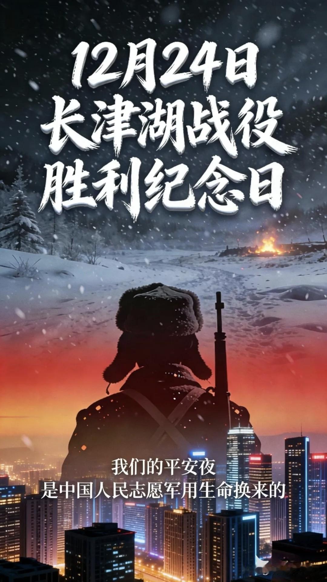 寒土埋忠魂,热血化星河!今夜,致敬长津湖战役英魂。 七十五载前的今夜——1950年12月24日,零下四十度,脚踏薄胶鞋、口嚼冰土豆,却将美军王牌逼入“史上最漫长溃退”。那群最可爱的人,以血肉之躯,在冰雪中刻下战争史的奇迹丰碑。 那一夜,九万志愿军踏着雪脊潜行,将敌军斩成五截; 那一夜,“冰雕连”枪口仍指前方,凝成塑像也寸步不让; 那一夜,杨根思抱炸药扑入敌群,用“人在阵地在”的怒吼写完最后一笔。 我们的钢铁装备稀缺,可血性与胆魄,比钢铁更坚!你能想象吗?为伏击敌军,勇士们伏在雪原纹丝不动,最终多人凝固成冲锋姿态的“冰塑”……他们却用血肉锁死阵地,击碎美军不可战胜的神话,逆转了整个战局!这,便是我们民族的脊梁! 每想到这些,胸口便像压了千钧。此刻的灯火可亲、寒意被挡在窗外,全是他们把年华和呼吸定格在硝烟里换来的。 今夜,不妨让屏幕暗下来,只在心底轻轻道一句:先烈啊,我们从未失约。你们的信念已融进了我们的血脉里。 岁月静好,因有人曾以身许国 青春正好,当以奋斗告慰英灵