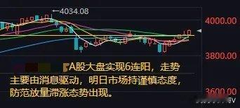 市场震荡走高呈普涨格局,短线需警惕超买回调风险今日A股三大指数高开高走,沪指收涨0.53%报3940.95点,深成指、创业板指涨幅均逼近1%,分别收于13486.42点、3229.58点,沪指斩获六连阳。两市合计成交额18802亿元,较前一交易日缩量196亿元;全市场5164只个股中3988只收红,超9%涨幅个股达106只,呈现普涨态势。盘面上热点轮动提速,商业航天概念持续爆发,板块内20余只成分股涨停,神剑股份收获5连板,国机精工录得4天3板,上海港湾、九鼎新材、再升科技同步涨停;算力硬件板块跟风拉升,环旭电子6天3板,英唐智控20cm涨停;福建板块、PCB概念亦表现活跃,安记食品7天4板,生益科技涨停创历史新高。贵金属、保险、乳业板块则领跌市场,乳业板块集体调整,庄园牧场跌停。板块层面,512个板块中491个收红,商业航天、军工电子、卫星导航等板块涨幅居前;资金流向呈现分化,大盘全天净流入12.54亿元,其中上证净流出29.53亿元,深证净流入42.83亿元;成交额方面,上证成交7739亿元,较前一交易日缩量329亿元。当前A股全线指数日线级别均已呈现钝化超买信号,市场行情以消息驱动为主,向下回调风险随时可能释放。对于明日走势宜保持谨慎,重点防范放量滞涨的盘面特征出现。