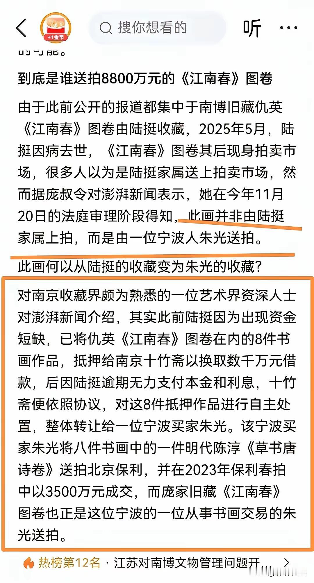 庞家由追查《江南春》开始,有关国宝的真相即将到来: 艺兰斋怎么拿到的《江南春》,还有没有其他的? 神秘富豪朱光又是谁?朱光5000万现金从南京十竹斋打包拿走八幅古画,其中就有江南春; 徐湖平他有没有监守自盗? 庞家捐赠文物 江南庞氏 金陵博物志 江苏艺术馆 上海春艺术馆 庞家捐赠艺术品