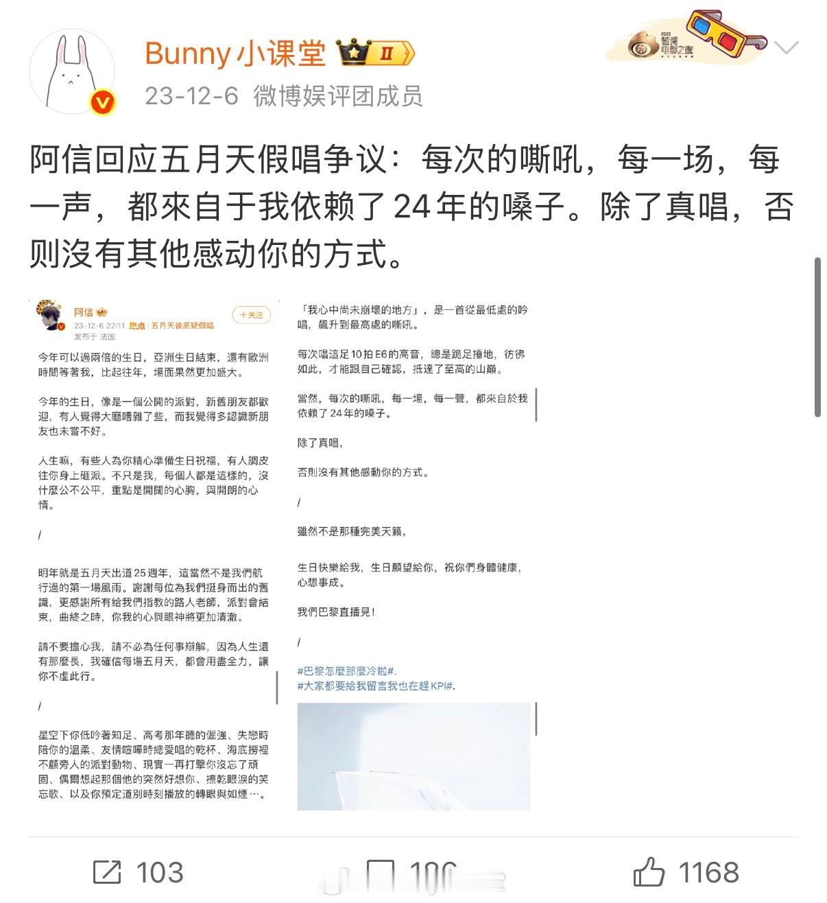 朱孝天又又又回应了:我唱歌的时候会有点跑调,可还是坚持全开麦,因为我觉得不能欺骗消费者。昨天阿信发文感谢朱孝天,朱孝天说场面话,听听就算了……去年五月天陷假唱争议,现在朱孝天说自己坚持全开麦,这算是明涵阿信了吧