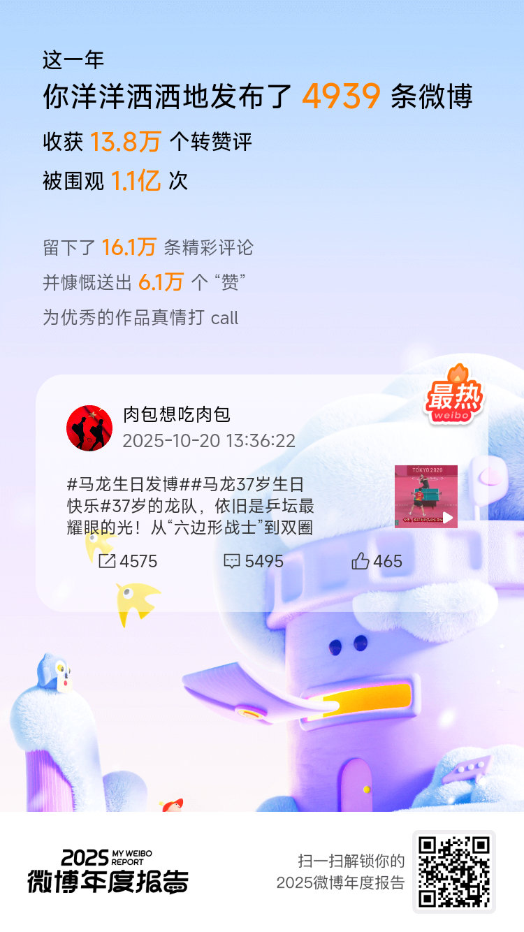 今年在微博365天,微博要不要给我发一个全勤奖, 还有感谢家人们一路力挺!明年我们依旧。来看看你的年度总结吧~点击开启>>2025微博年度报告 微博年度报告微博之夜全网热点共创计划