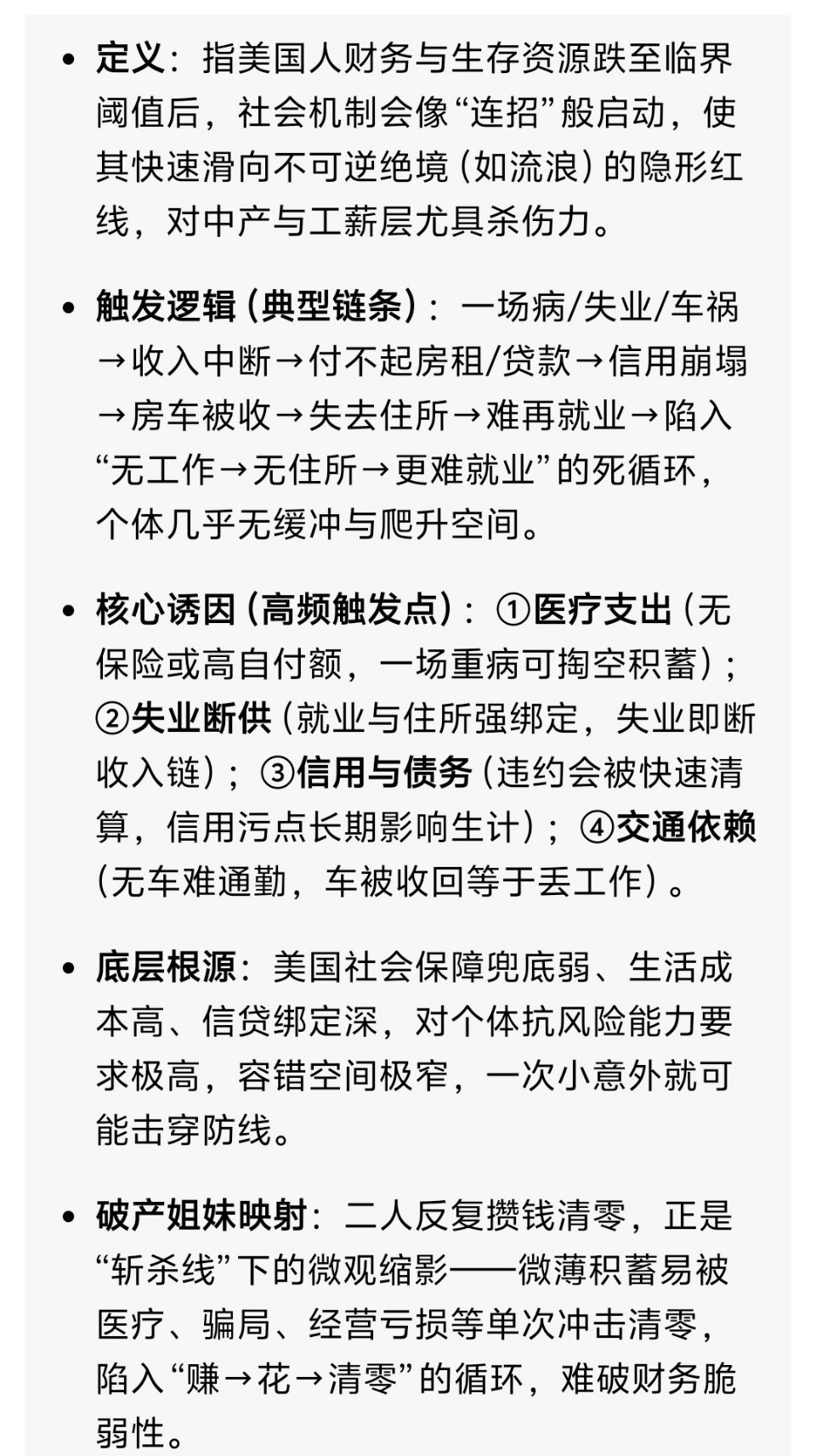 美国斩杀线美国斩杀线 3步极简触发清单1. 单次突发冲击(重病、失业、意外)直接中断收入或耗光微薄积蓄。2. 核心生存刚需(房租、车贷、社保)断供,触发信用崩塌与资产清算。3. 陷入无资产无信用的恶性循环,丧失生计支撑,滑向绝境难逆转。