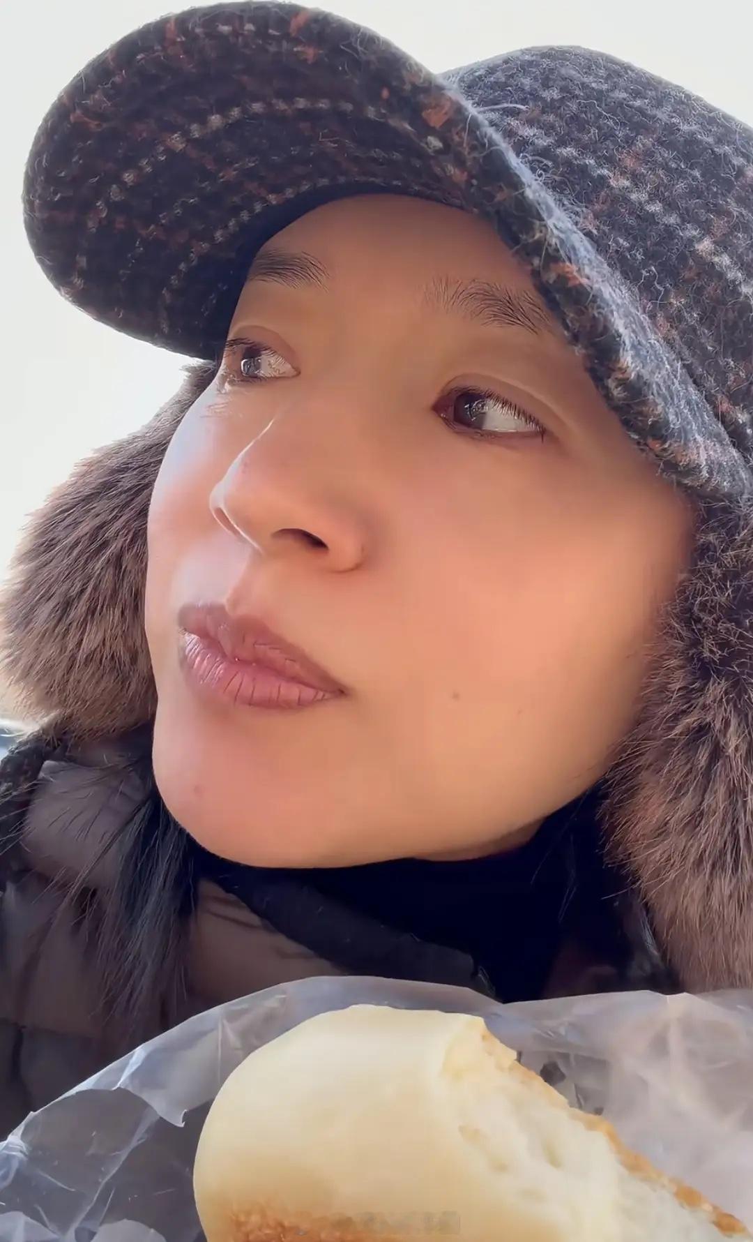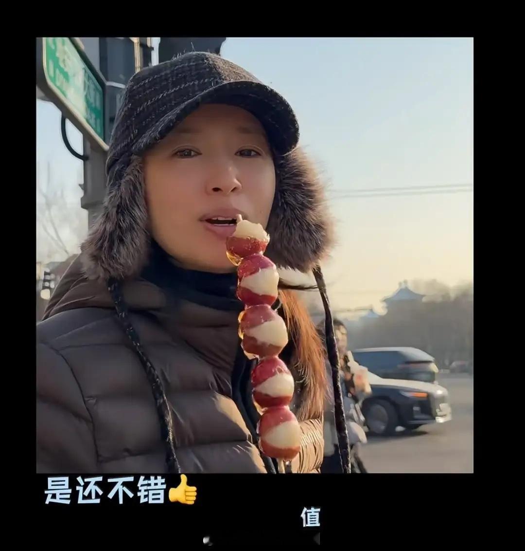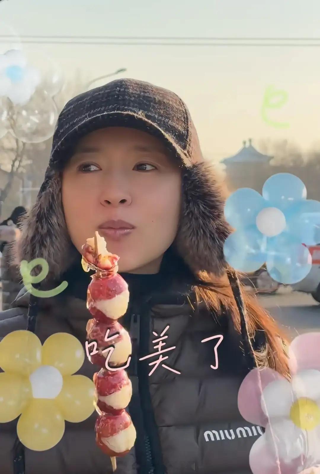 董洁骑行游北京,吃白膜糖葫芦羊肉串光吃不胖,45岁穿得像老太太!