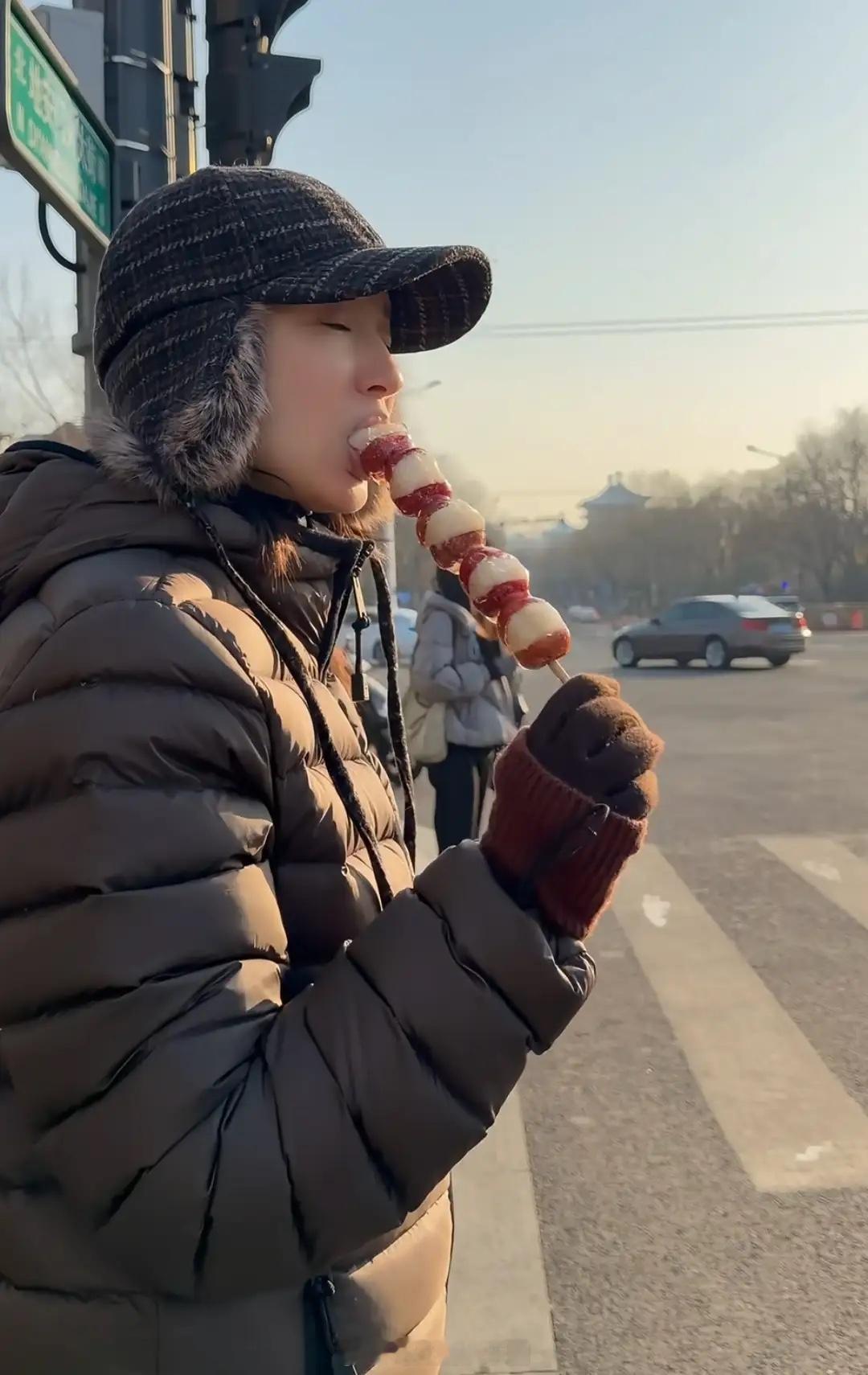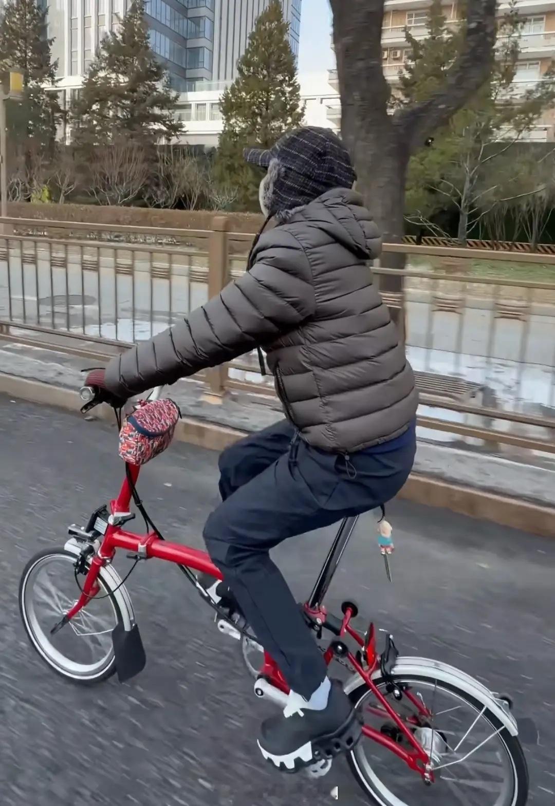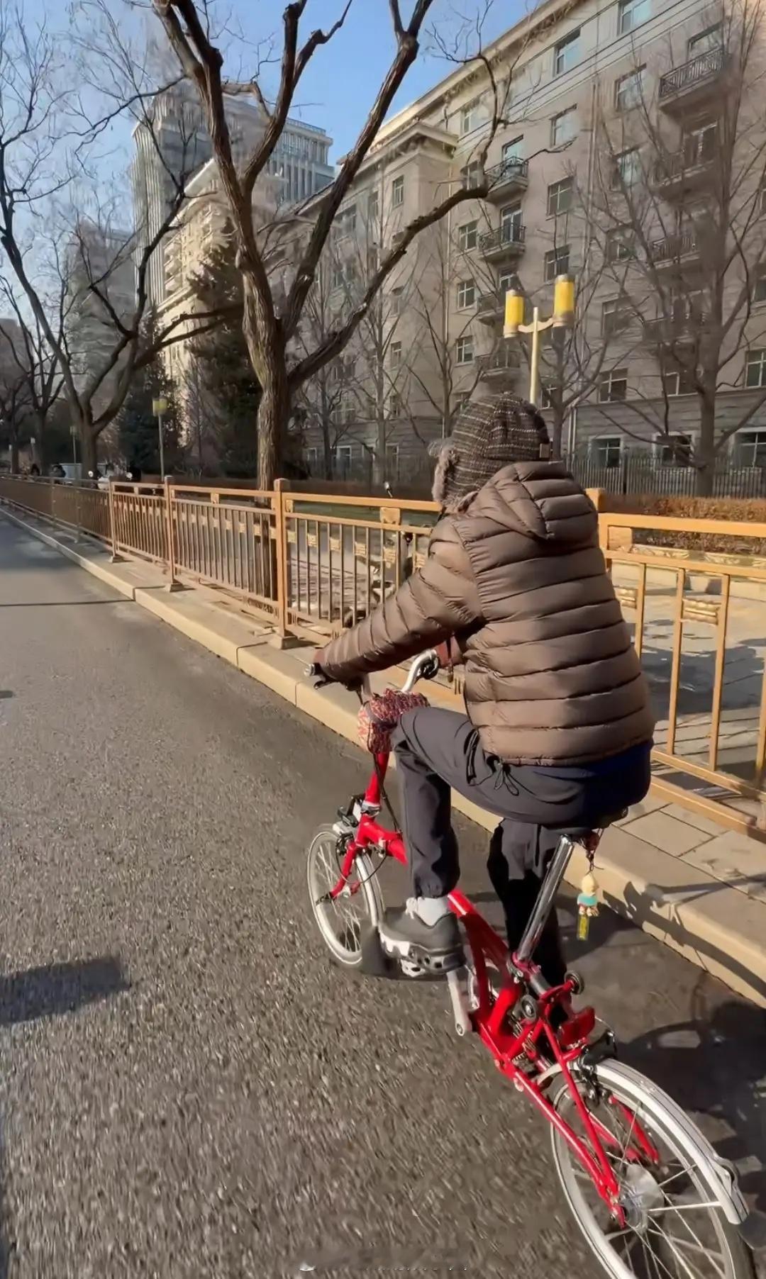董洁骑行游北京,吃白膜糖葫芦羊肉串光吃不胖,45岁穿得像老太太!