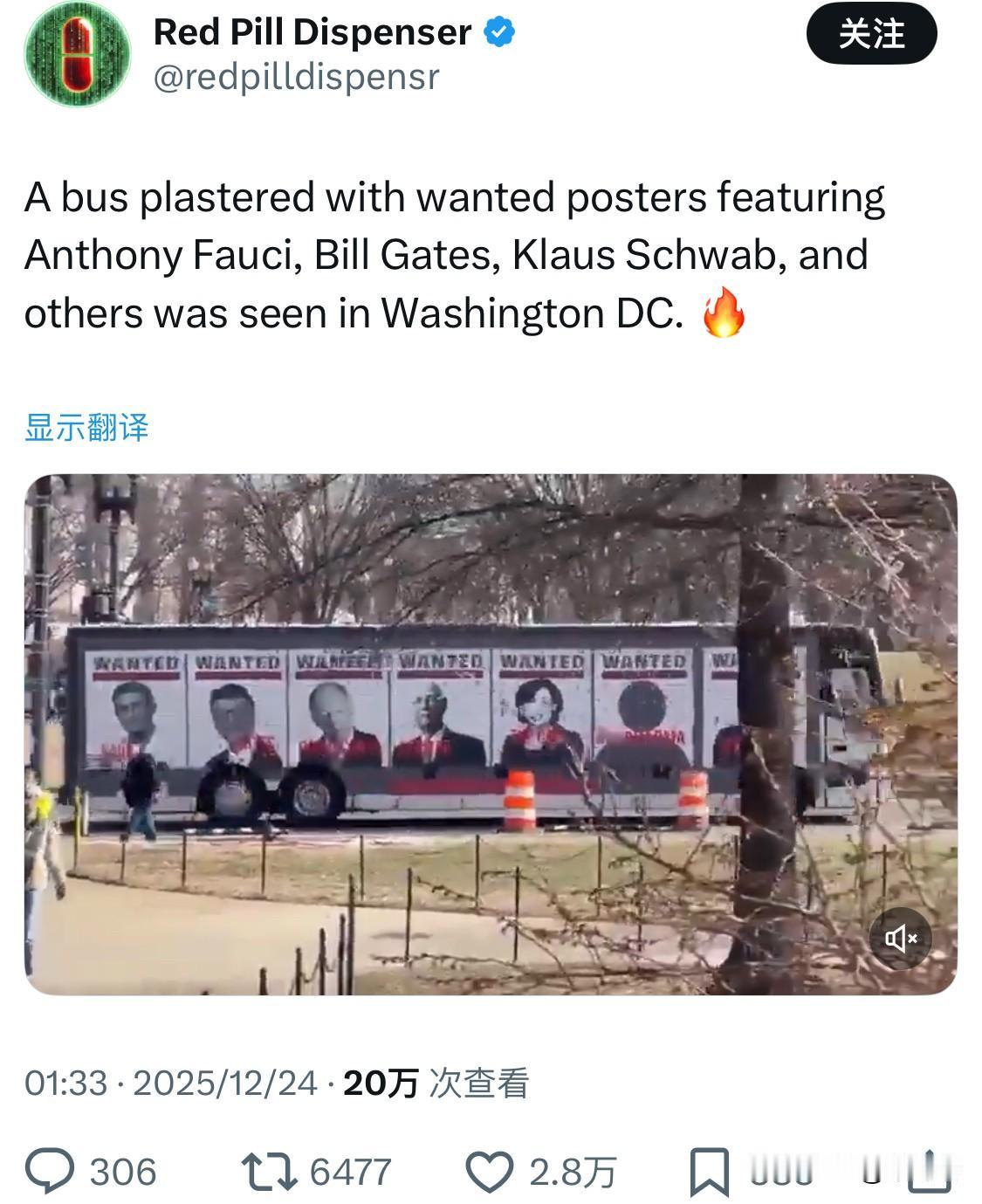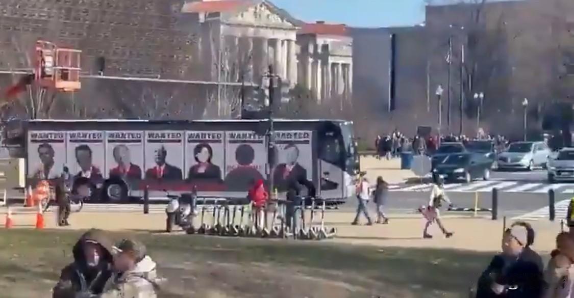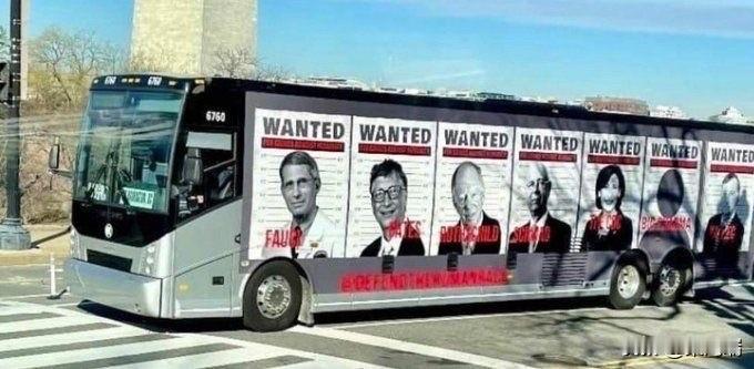 在华盛顿特区,一辆贴满通缉令的巴士被发现,通缉令上印有安东尼·福奇、比尔·盖茨、克劳斯·施瓦布等人的名字。 这辆巴士是一辆抗议艺术巴士,车身贴有包括安东尼·福奇(Anthony Fauci)、比尔·盖茨(Bill Gates)、克劳斯·施瓦布(Klaus Schwab)在内的一系列公众人物的“通缉令”海报。这辆巴士曾在华盛顿特区出现,与反新冠疫苗强制令的集会或阴谋论相关的活动有关。