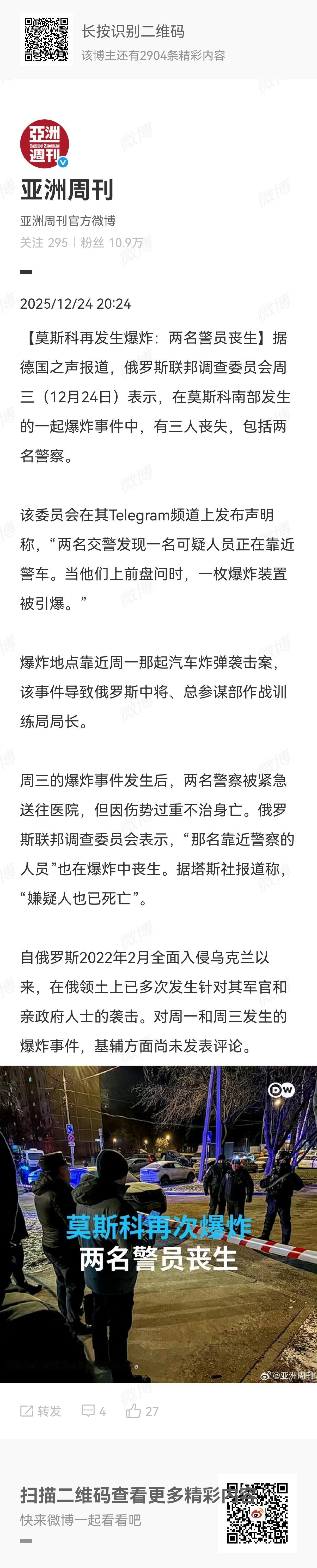 12月24日已经多家媒体报道:俄罗斯联邦调查委员会周三(12月24日)表示,在莫斯科南部发生的一起爆炸事件中,有三人丧失,包括两名警察。这事儿大概率是乌克兰政府搞得,战场上捞不回来的,就会搞一些针对群众或政府人员的恐怖袭击。当然乌克兰是不会承认是自己干的,甚至可能说是俄罗斯自己搞的。无论是不是乌克兰,和平还很遥远,停战也还停留在口头上,这个冬天士兵们还要继续在雪地里面掐架。