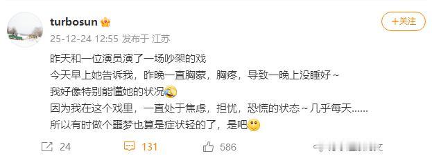 普通人真的别羡慕有钱人,他们的焦虑和担忧,一点不比我们少。 演员孙俪,昨晚在社交平台发布了一则短文,主要是倾诉内心的烦恼,网友看过之后表示:原来,即便是一线大明星,在工作时也怕这怕那啊。 孙俪在短文中提到了两件事: 第一:她正在拍新戏,生怕演不好,每天都处在焦虑、担忧、恐慌的状态,还会时不时的做噩梦,连觉也睡不安稳。 第二:这样的状态不止她一个人有,同剧组的另一位演员也会在拍戏后陷入胸闷胸疼的状态。 频繁出现这种状态的原因,就是因为怕演不好戏、怕领导不满意、怕观众不喜欢、怕达不到自己的预期,才会在害怕和焦虑的双重压力下,身体产生了痛苦反应。 这说明,即便是处在一线的大明星孙俪,也和普通人的烦恼一样:一旦工作,就会压力山大,哪怕在之前已经有了很高的成就,但想做好手头的事,就必须全力以赴,面对各种挑战。 看来,即便是功成名就,想要持续在领域里发光发热,就会有焦虑和担忧,那么,普通人还有什么可羡慕有钱人的呢,其实大家都一样的烦恼不断。 有网友说:“明星都出来吐槽工作时的难了,我还有什么可抱怨的呢,加油吧。” 也有网友说:“一直以为像孙俪这样的专业演员,演戏是易如反掌,没想到也会焦虑,真是不可思议。” 还有网友说:“都已经那么有钱了,还在担忧什么呢?不演戏,或者演的不好又能影响什么呢?担忧属实多余了。” 那么,你怎么看待这件事?