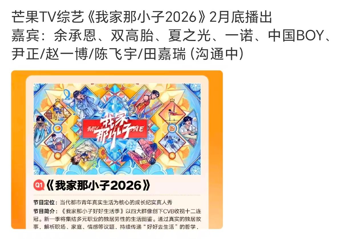 我家那小子2026拟邀阵容我家那小子2026网传嘉宾 我家那小子2026 :余承恩、双高胎、夏之光、一诺、中国BOY、尹正/赵一博/陈飞宇/田嘉瑞(沟通中)