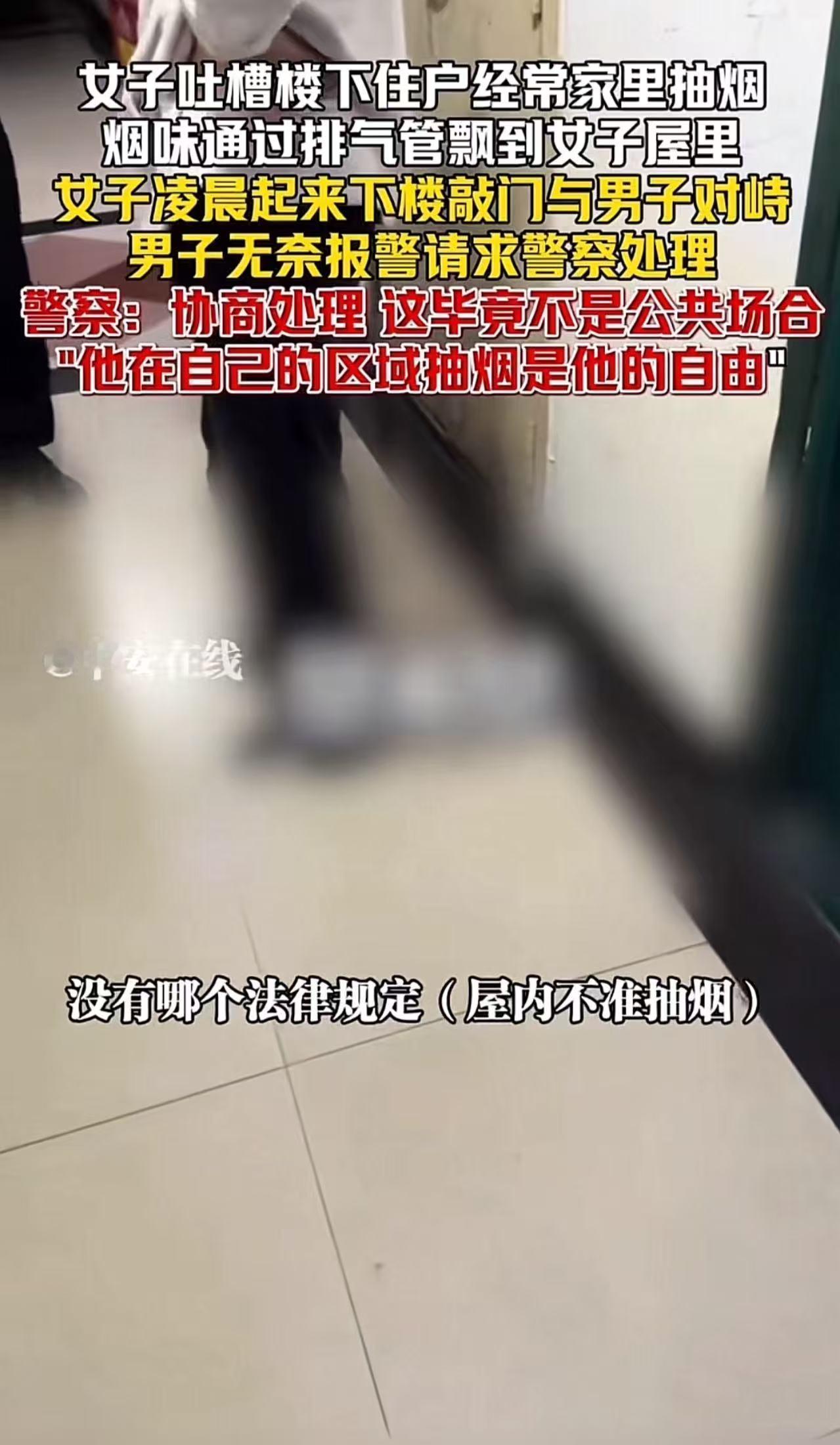 小仙女真的无敌了!四川,男子在自己家里抽烟,楼上女邻居下来敲门,让男子不要抽了,说烟味通过排气管飘到她家里来。楼上男子都懵了,自己在家里抽烟,女子还能管的着?于是男子让女子报案,可民警来了以后,让女子傻眼了! 清晨五点半的宁静,被一阵急促的敲门声骤然打破。 四川一户居民家中,男主人正沉浸在睡梦中,门外的叫门声却裹挟着怒气直冲耳膜。 开门后映入眼帘的,是楼上女邻居满脸的愠色。 究其缘由,是男子在家抽烟产生的烟雾,顺着排气管飘入了女邻居家中。 这样的情形并非首次发生。 此前女邻居已经就烟味问题多次与男子沟通,可在男子看来,自家的私人空间里,抽烟是不容置喙的个人自由,邻居的屡次提醒,不过是无端的小题大做。 这一次,刺鼻的烟味再次在清晨钻入女邻居家中,积攒的不满彻底爆发,这才有了上门对峙的一幕。 本应和睦相处的楼上楼下,就这样被一缕烟味搅得剑拔弩张。 事实上,因住户在家抽烟、烟味串户引发的邻里矛盾,在城市小区里并不鲜见。 看似是一件小事,背后却藏着双方难以调和的认知分歧。 在抽烟者的立场上,住宅是私人领地,只要不违背公共场合的禁烟规定,自己在家中何时何地抽烟,都是他人无权干涉的自由。 可在受烟味侵扰的邻居眼中,飘散而来的烟雾不仅污染了自家的空气,还可能影响老人孩子的身体健康,这分明是自身的生活权益受到了侵犯。 一方觉得理所当然,一方认为不堪其扰,邻里之间的分寸感,就在这样的拉扯中逐渐失守。 矛盾爆发后,双方的处理方式,往往会让事态雪上加霜。 就像四川的这名女邻居,交涉未果后选择用激烈的言辞表达不满,情绪上头时更是直接报警。 满心期待能得到民警支持的她,最终却听到了这样的答复:“协商处理,这毕竟不是公共场合,他在自己的区域抽烟是他的自由。” 这样的结果让女邻居难以接受,一气之下便将事情的经过发布到网上,希望能得到网友的声援。 帖子一出,评论区瞬间分成了两大阵营。 有人感同身受,吐槽自家也曾遭遇同款烦恼,楼下住户的烟味无孔不入,让人苦不堪言; 也有人直言女邻居太过矫情,既然无法忍受烟味干扰,不如直接购置独栋别墅,没必要对他人的私人生活指手画脚; 还有人给出了实用建议,认为在烟道安装止逆阀,就能从根源上解决烟味串户的问题。 女邻居因烟味受扰而生的怨气值得理解,但动辄上门争吵、报警处理的方式,确实算不上明智。 而抽烟的男邻居,即便手握在家抽烟的自由,也不该对邻居的诉求置之不理。 毕竟,邻里之间低头不见抬头见,一味强调个人自由,却忽视他人的生活感受,终究不是长久之计。 想要化解这类矛盾,其实并没有想象中那么复杂。 抽烟的住户不妨多一份体谅,比如避开邻居休息的时间抽烟,或者主动安装止逆阀、打开空气净化器,从源头上减少烟雾扩散。 而受烟味困扰的邻居,也可以试着换一种沟通方式,不必带着怒气上门理论,不妨心平气和地说明自家的难处,和对方商量解决办法。 邻里相处,本就该是一场双向奔赴的包容。 少一分针锋相对的争执,多一分换位思考的体谅,那些因一支烟而起的风波,自然也就消弭于无形了。 今天的分享到这里就结束了,大家对此事有何看法,欢迎在评论区留言和讨论,感兴趣的可以点击头像加关注,我将每日更新优质内容,我们下期见。