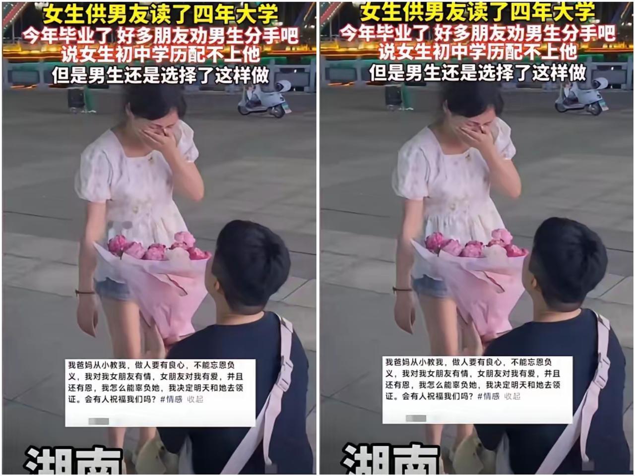 泪目了!湖南,男孩考上大学却没钱去读,女友打工供他读书!4年后男孩学业有成 湖南男孩被女友打工供读4年,功成名就时朋友劝分,他却用一束花、一个单膝跪地的承诺,向女孩求婚。分明是把四年的亏欠、心疼、感恩,全揉进了“想和你一起走”的底气里! 有人说“学历差距大难长久”,可男孩偏记得:当年他蹲在田埂哭说“不读了”,是女孩塞给他攒了半年的零钱;他熬夜刷题时,女孩在流水线盯着机器打盹;他拿奖学金时,女孩正因加班错过末班车,走在黑夜里给自己打气。这些细节,比任何“配不配”的标签都更有分量! 感情里最珍贵的从不是“条件相当”,而是“我见过你最落魄的样子,却依然想和你共享荣光”。那些劝分的人,大概没尝过“共苦”的甜——当一个人为你扛过所有苦,你怎舍得让她输? 你觉得“门当户对”和“真心值得”,哪个更重要?