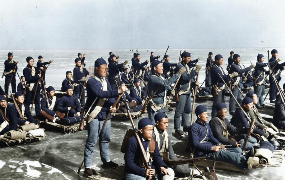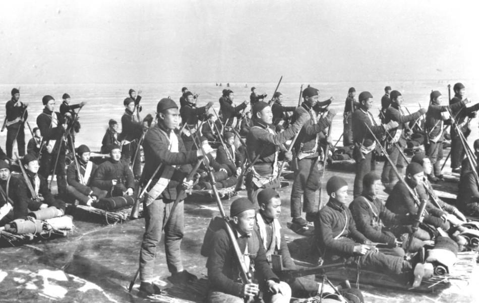 抗日战争时期,白洋淀雁翎队,由八路军摄影记者石少华摄于白洋淀冰面上。 数十名雁翎队队员身着棉衣、头裹毛巾或棉帽,乘坐在冰橇上或站立,整装待发。许多人手持长管土枪,表情坚毅。身后是一望无际的冰封淀面。 雁翎队成立于1939-1940年,由冀中安新县当地渔民、猎户组成,中国共产党领导,最早成员20余人,后发展至120多人。队长陈万、副队长邓如意等,利用白洋淀143个淀泊、纵横苇壕的地形优势,神出鬼没地开展水上游击战。 武器主要为民间猎枪“大抬杆”和普通火枪,为防潮常在火门插雁翎,故名“雁翎队”。另有说法称小船队形如雁群“人”字。全队作战70余次,击毙俘获日伪军近千人,截断敌水上运输线,拔除据点,锄奸除害,被誉为“淀上神兵”。民谣唱道:“雁翎队,是神兵,来无影,去无踪。千顷苇塘摆战场,抬杆专打鬼子兵。”