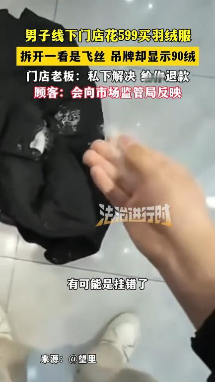 “必须严惩!”12月23日,河北廊坊,一男子在服装店里,花599元购买了一件羽绒服,吊牌上写着填充物是白鸭绒,含量更是高达90%!可男子拆开后却发现,里面全都是飞丝,质疑商家的合格报告是怎么来的。网友:没有成本全是利润! 随着冬天的到来,羽绒服又成为大家御寒的必备品,不过这几年鸭绒的价格涨得厉害,不少人担心便宜买不到真货,贵的又买不起,只是没想到,贵的竟然也是假货。 当天晚上,男子来到一家女装店,店员立即热情的介绍起店里的衣服,不断夸赞质量好、穿着暖和,男子精挑细选后,花599元购买了一件黑色的长款羽绒服,店员还说给优惠了100元。 男子走出店门后,就找了一个隐蔽的角落“验货”,结果拆开羽绒服后,发现里面根本不是鸭绒! 发现自己上当受骗后,男子气愤地回去讨个说法,没想到店员在发现男子正在录像后,竟然上手抢夺摄像机。 之后男子给服装店老板打去电话,对方一开始辩称是“绒丝”,之后又请求男子私下解决,不要举报,可是男子并没有惯着他,直接将情况反映给了有关部门。 虽然说买东西都是一分价钱一分货,但既然商家把东西卖得这么贵,就必须保证质量没有问题,如果连高价买到的都是假货的话,那谁还敢买东西? 信息来源:《男子花599买羽绒服出店剪开全是飞丝 老板狡辩是“绒丝” 男子表示向相关部门反映》陕视新闻