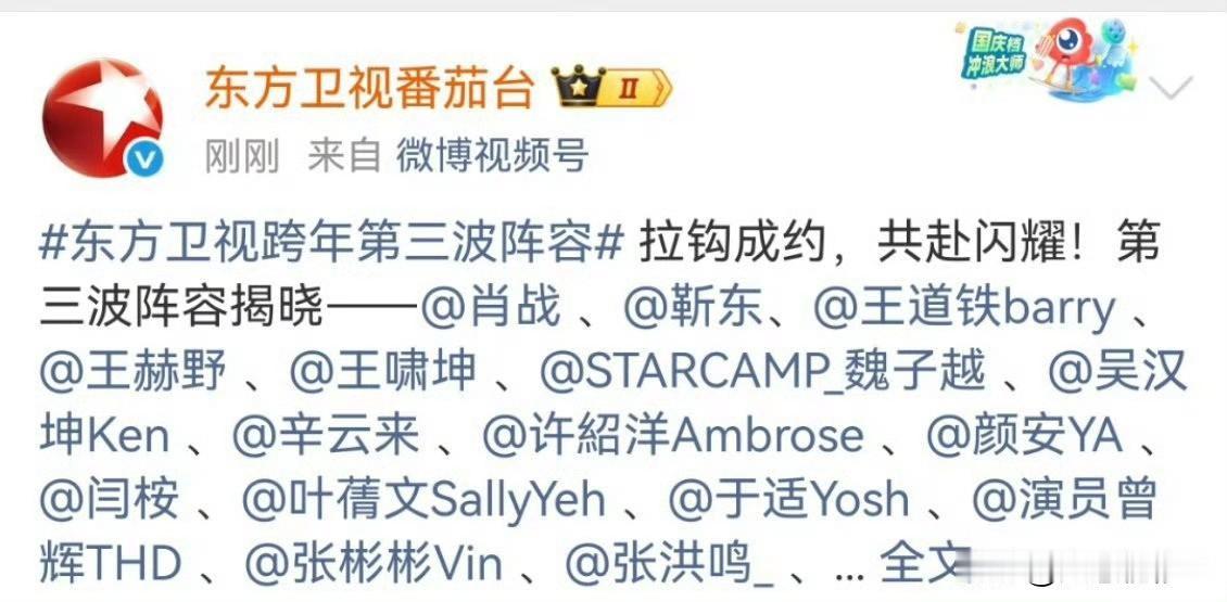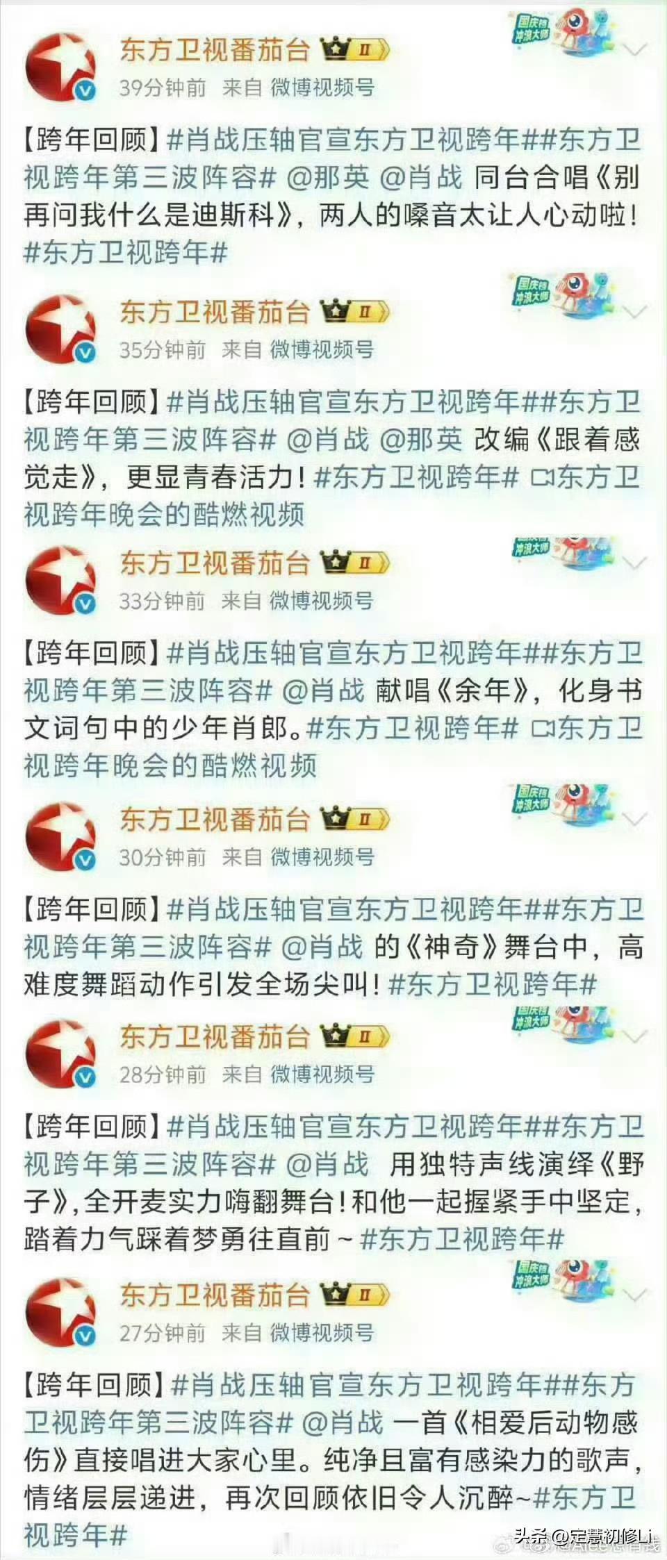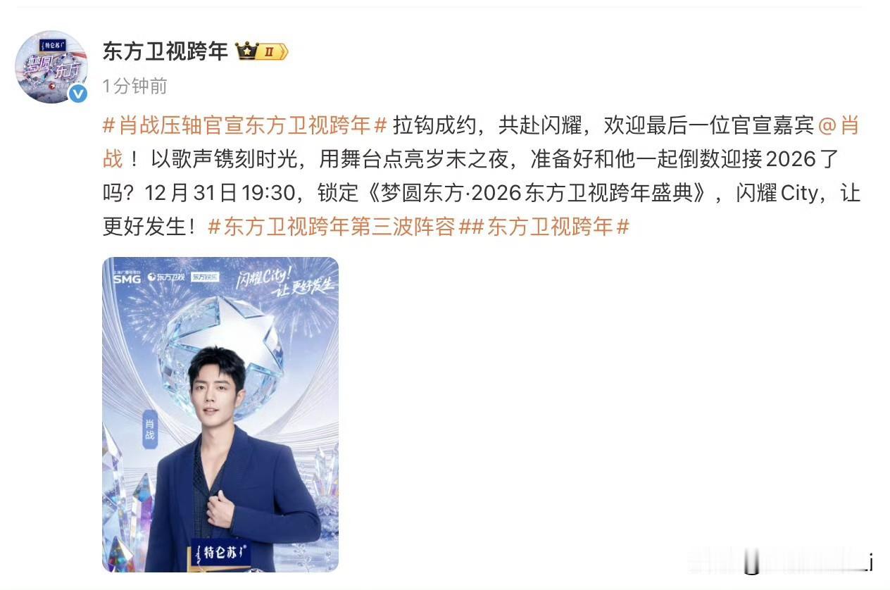 重磅嘉宾当然独挑大梁压轴出场,东方卫视给足了排面,全部嘉宾宣玩完,主持人宣完,最后肖战出场,连主持人都预告说“超级炸裂”,有多炸裂,宣了肖战就知道了。东方卫视连发六条肖战在东方卫视的舞台,微博阅读讨论量几个小时就高达5亿,这就已经足够炸裂了。就等肖战的红海和魅力四射的舞台了,所有人搓手手热烈期待[比心][赞]红海红海红海,去的幸运🦐🦐不要忘了检查灯牌啊。要租借的也赶紧行动起来