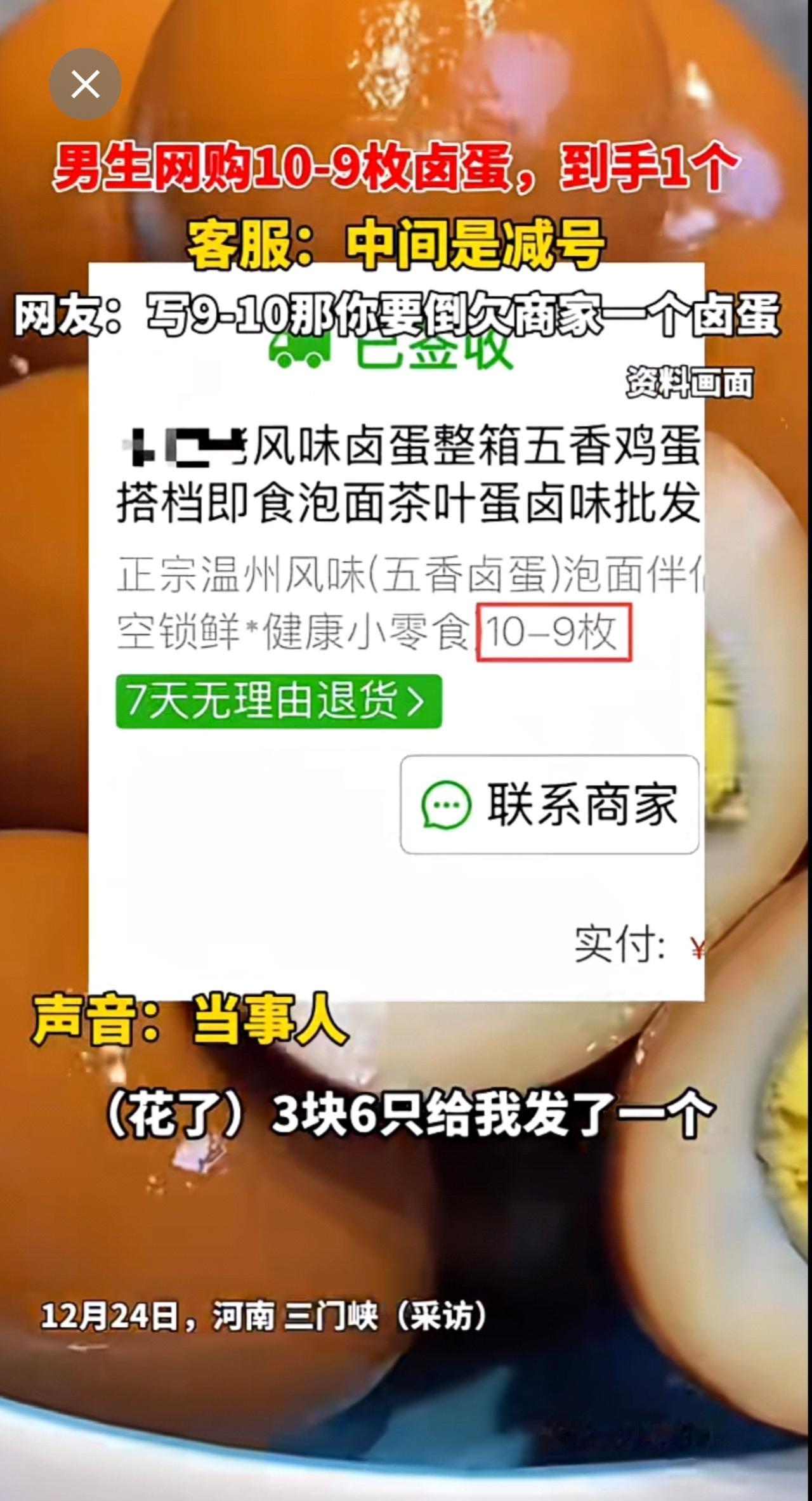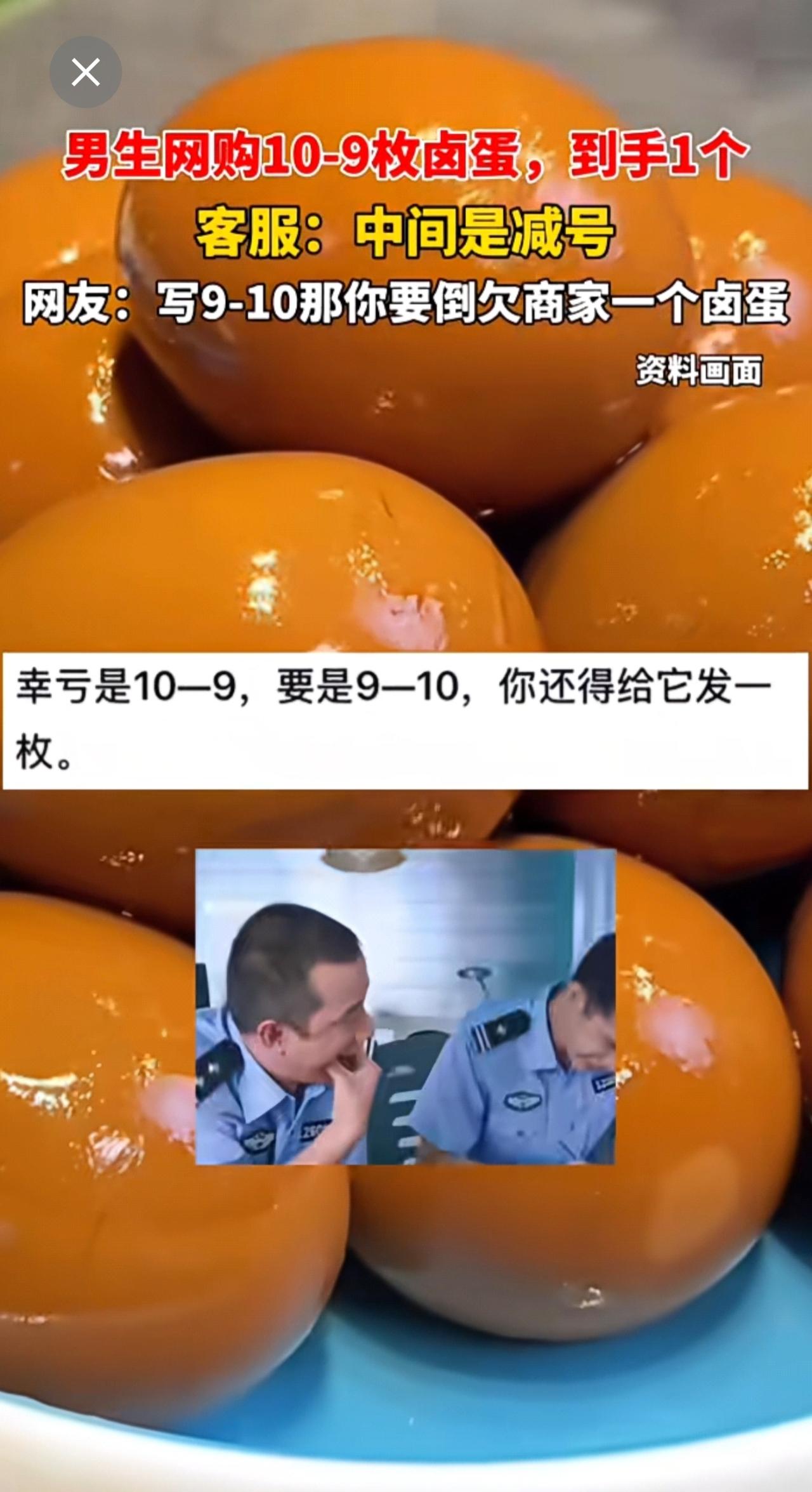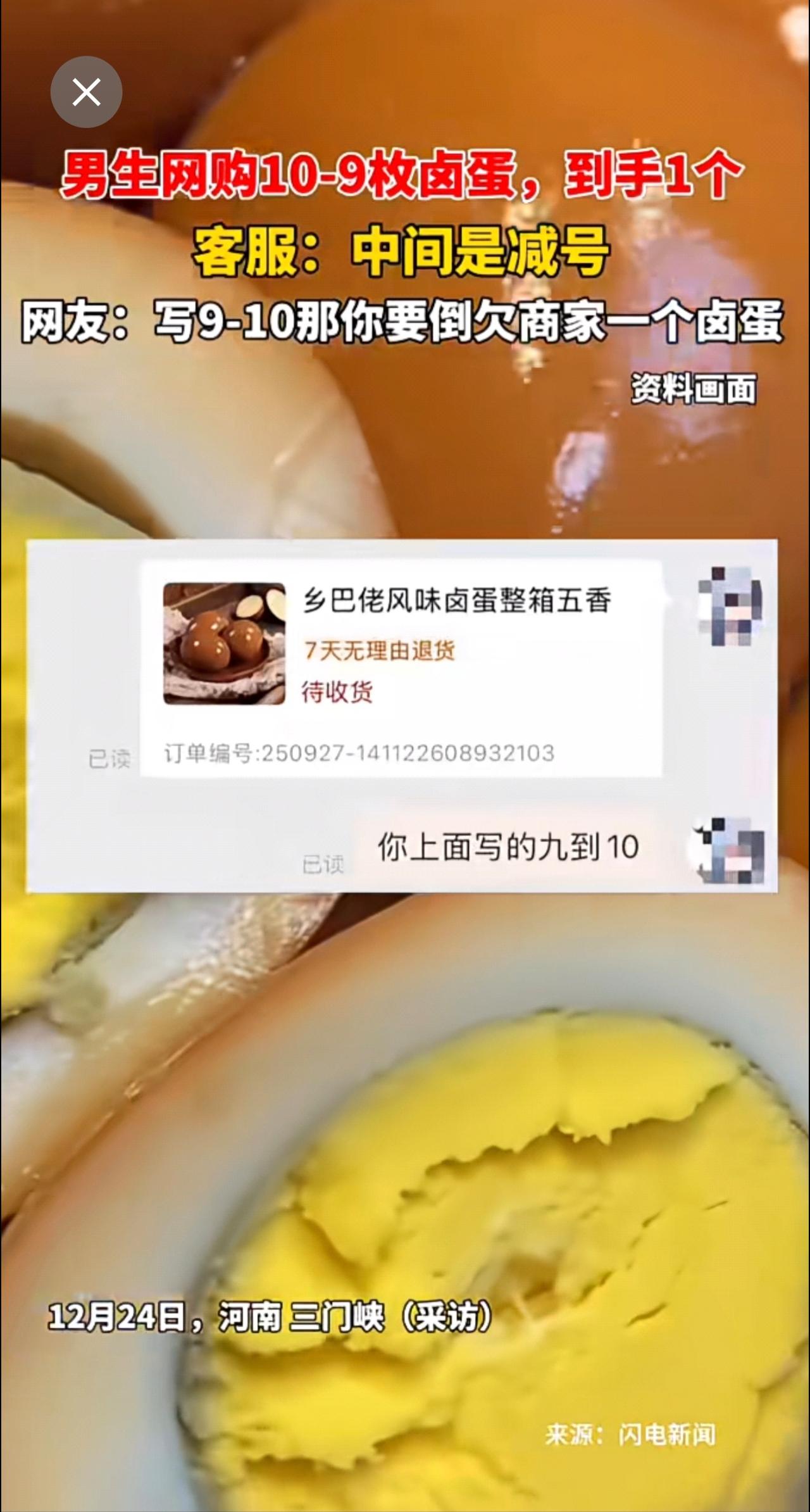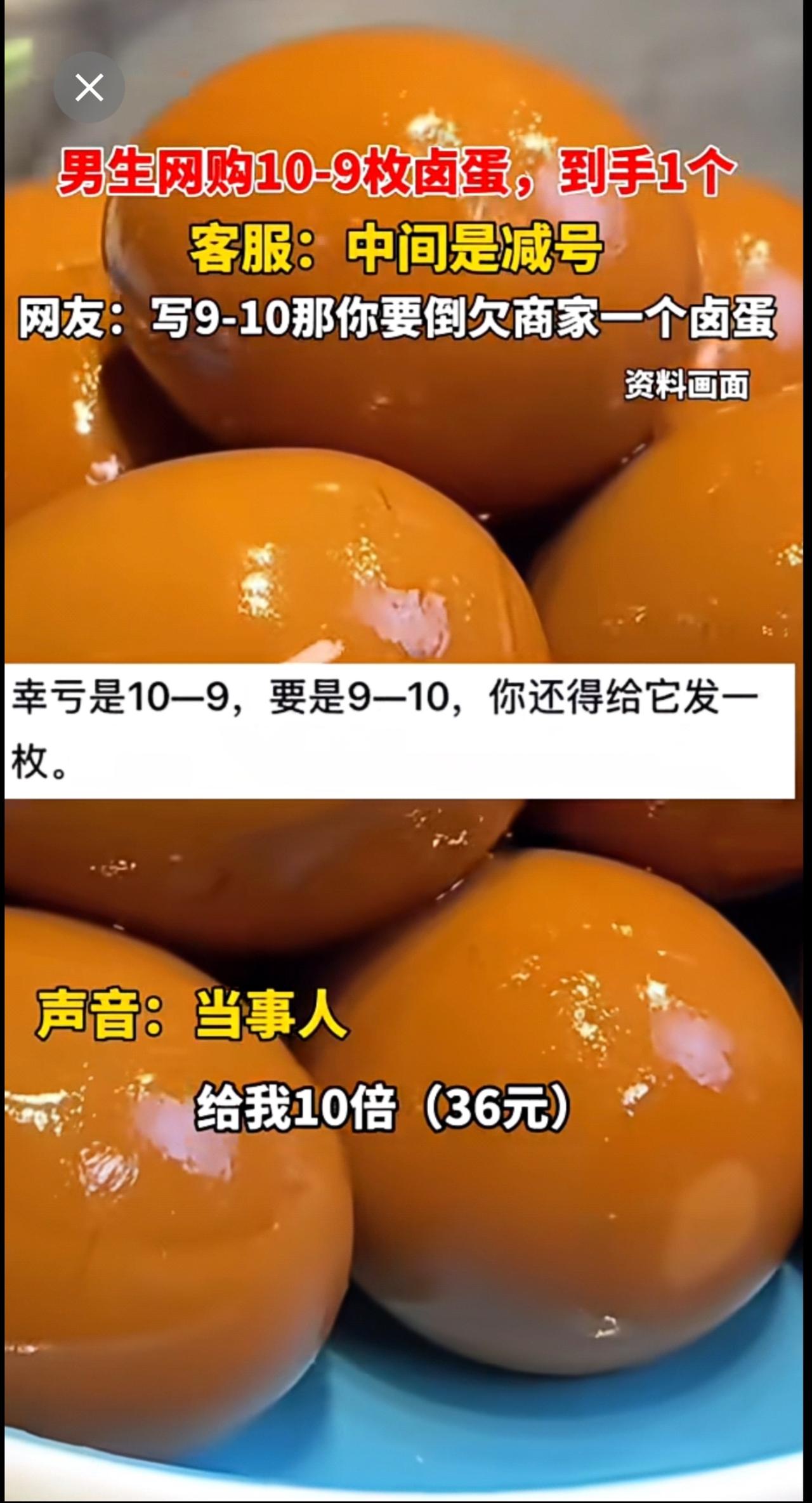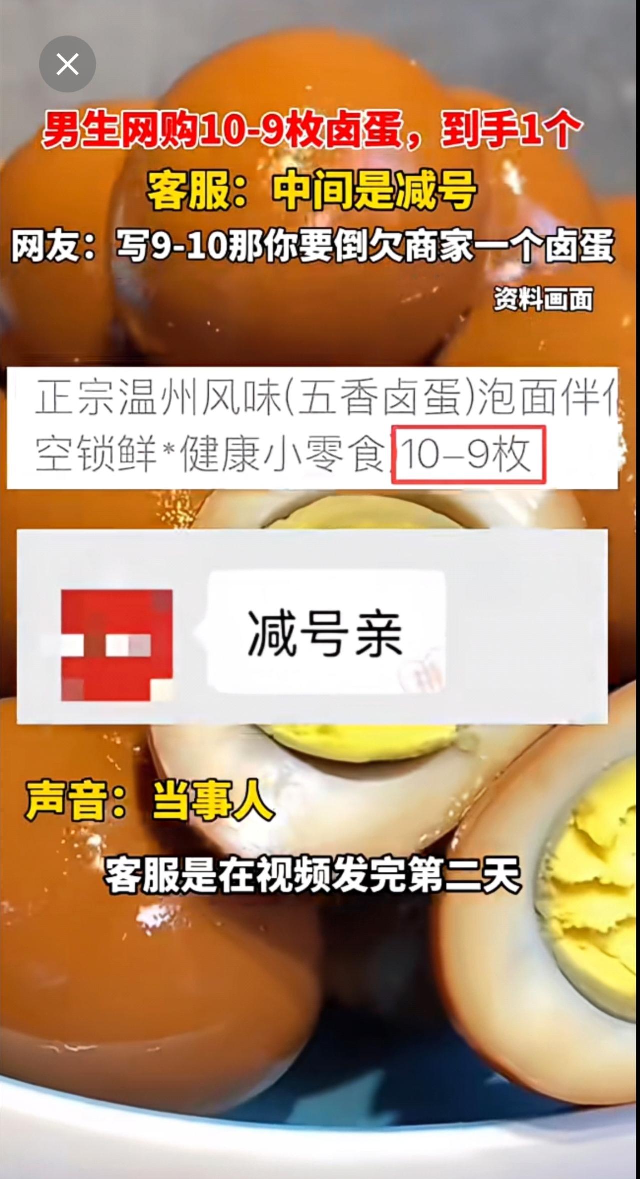 男生网购10-9枚卤蛋,到手1个,客服:中间是减号!!!网友:写9-10那你要倒欠商家一个卤蛋[捂脸]