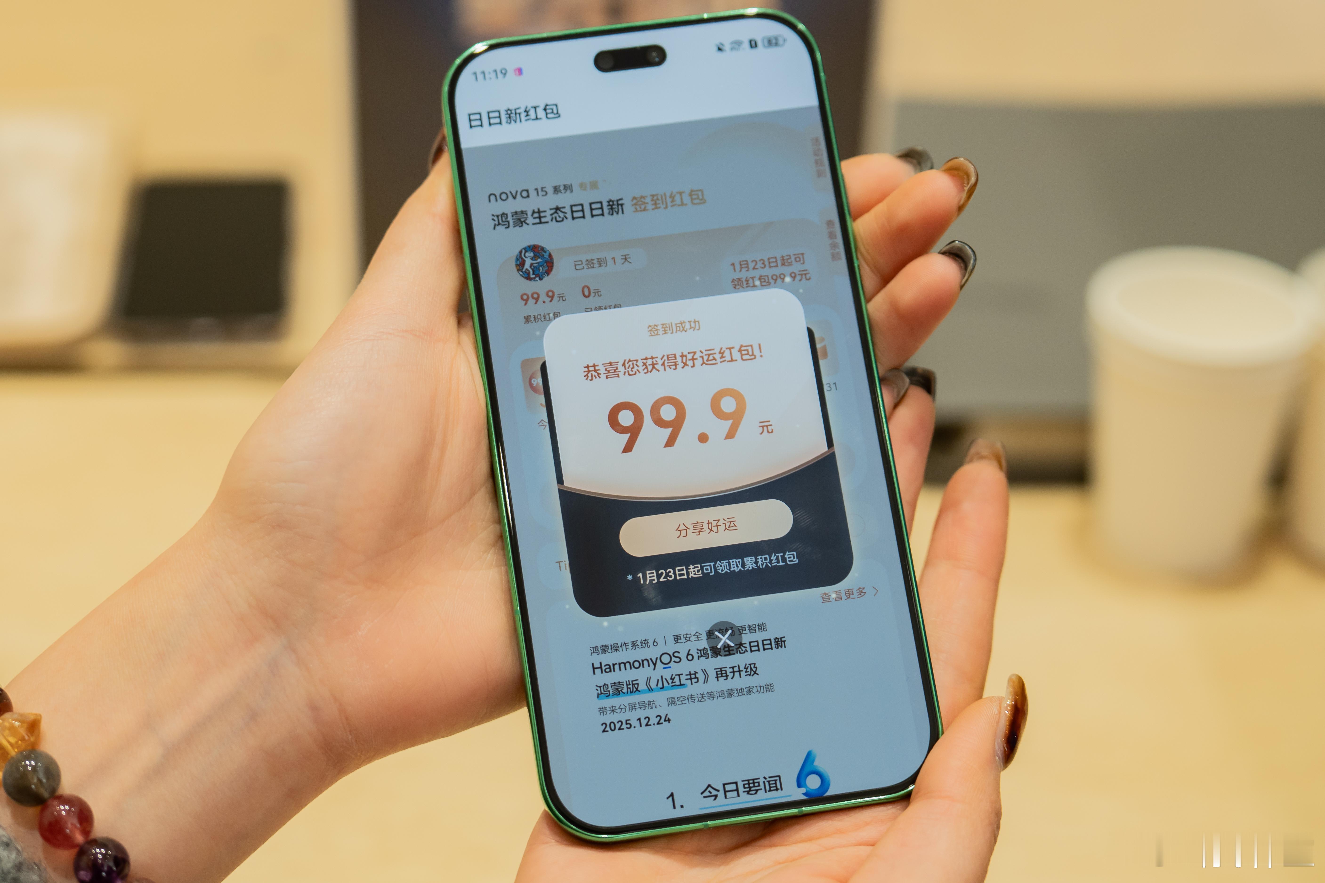 nova15系列开售人人我人人今天nova 15系列开售了,一大早华为门店就热闹起来了!排队队伍都七拐八拐的,全是来提nova15的。听店员说库存走得飞快,很多亮眼配色上午就断货了。 这次nova 15系列的升级真的很实在,首发搭载后双红枫影像系统,拍照效果肉眼可见的提升。全系支持鸿蒙6系统,还有卫星通信等旗舰配置。机身仅6.8mm,手感也是一绝!加上现在有国补政策,算下来性价比超高,现场还能直接领鸿蒙日日新红包,难怪这么多人都来抢首发。 不少年轻人一拿到手机就在门口开箱体验,感觉这次换机特别值,那兴奋劲儿不少路人也来围观。最近想换手机的朋友们可以考虑冲一波!