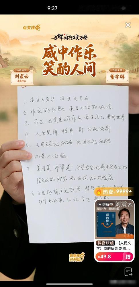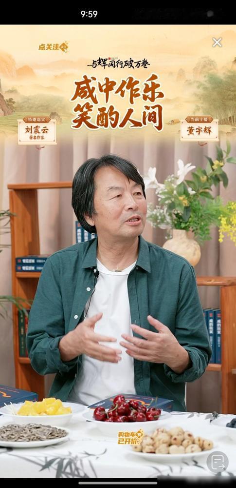 道可道,非常道。当宇辉开始举起一张提纲做总结陈词的时候,聪明的刘震云老师知道访谈进入尾声了。 本来这场直播按节奏在九点半多就该收尾了,结果刘老师完全没打算按套路出牌。他在宇辉总结到第7点的时候直接给打断了,反手开启了“报菜名”模式。 这种场面确实挺罕见的,一般嘉宾到点都想赶紧撤,但他硬是把结束时间从9:37拖到了10:03。 这多出来的26分钟,与其说是刘老师不想走,倒不如说是他太懂怎么在这个流量场里反客为主。 我感觉这种“心眼多”其实是对顶级文人的一种褒奖,他能把枯燥的总结变成一场大型的延津老乡招募盛会。 评论区在那儿刷屏说要自带酒菜去他老家,这就说明他不仅是把书安利出去了,还把那股子烟火气植入到了大家脑子里。 最逗的是宇辉当时那个无奈又好笑的样子,明显是遇到了真正的控场大师。 其实这种“拖延”反倒显出了节目的松弛感,比起那些掐着秒表下班的访谈,这种聊嗨了舍不得撤凳子的氛围才最勾人。 大概只有这种级别的心眼,才能在谈笑风生间,把卖书这种事儿做得这么不着痕迹又理直气壮。