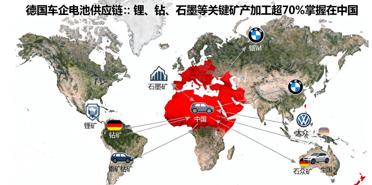 德国汽车工程师说:情感上很难接受中国电动车技术反向输出欧洲;但现实是德国车企的电池供应链高度依赖中国矿产,翻开任何一家德国车企的电池供应链报告,锂、钴、石墨等关键矿产的加工命脉,超过70%掌握在中国手中。 更赤裸的真相: ——全球73%的钴精炼产能在中国。 ——90%的球形石墨由中国供应。 ——就连宝马号称“欧洲血统”的电池,其原材料溯源最终指向江西锂矿。 这不是选择,而是生存。大众集团在萨尔茨吉特投资建设的电池工厂,生产线尚未启动,就必须先与中国矿产巨头签订长达十年的供应协议。德国引以为傲的“工业4.0”电动蓝图,从落笔那刻起就依赖东方提供的“墨水”。 最深的依赖藏在细节里:当德国工程师调整电池配方时,他们必须等待中国冶炼厂提供特定纯度的锂化合物样品。这种从矿产标准到技术路径的全链条依赖,已让“德国制造”的电动心脏,跳动着中国的矿业节奏。 最终,方向盘或许还刻着德国徽章,但驱动未来的“新石油”,脉搏却由东方的矿山掌握。这份基于资源的现实,正在重塑汽车工业百年来的权力格局——技术可以追赶,但埋在山脉里的未来,早已标注了归属。