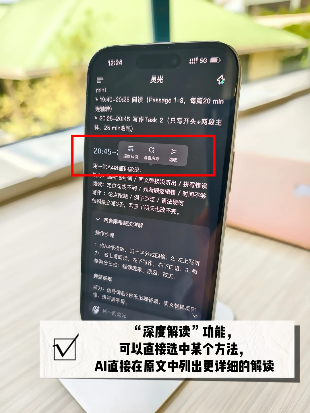 4️⃣有“深度解读”功能,例如它给出一个学习方法,你想知道具体怎么用,直接在那一段点击“深度解读”,AI就会在原文那段话里直接列出具体方法和步骤!