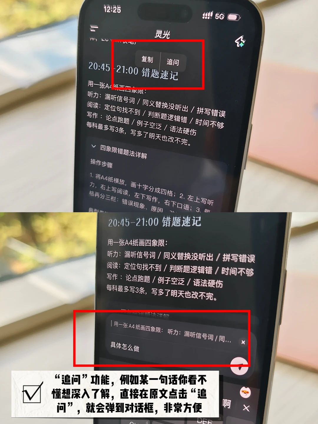 3️⃣有“追问”功能,比如它的解释里有一句话你看不懂,不用复制,直接点击追问,AI就会引用这句话直接跳到对话框,你直接输入问题即可,比GPT方便多了;