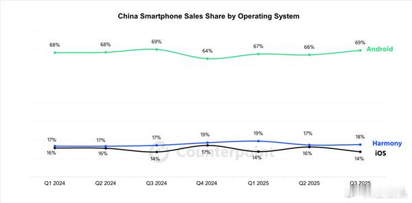 CounterPoint Research数据显示,华为鸿蒙操作系统三季度份额达18%,继续超越iOS,位列全国第二。截至12月,搭载鸿蒙5和鸿蒙6的终端设备数量突破3200万台,成为智能终端发展史上增速最快的操作系统。点赞华为~点赞鸿蒙~