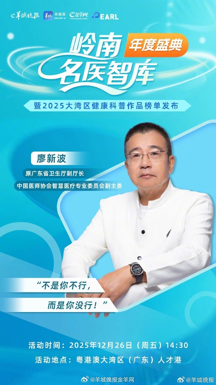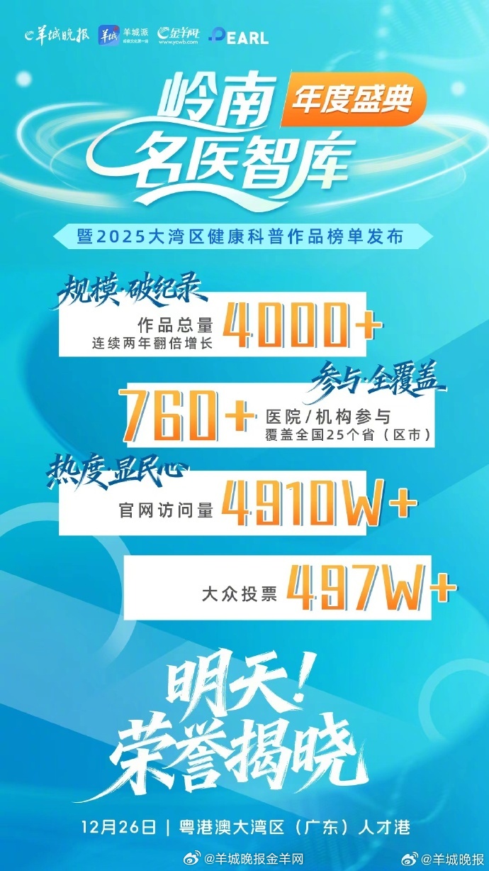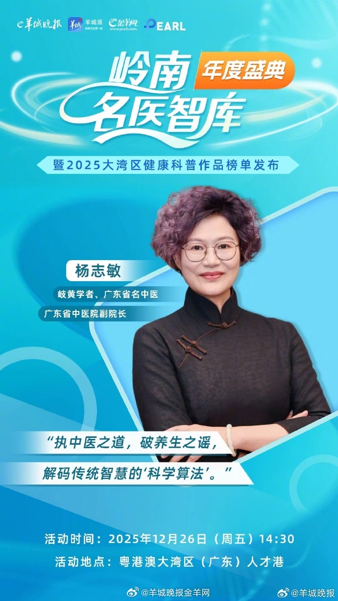 【倒计时1天!专家亲授养生干货?科普顶流长啥样?活动亮点抢先看→】#岭南名医智库年度盛典#明日即将开幕!亮点提前锁定:● 岐黄学者、广东省名中医、广东省中医院副院长杨志敏将带你执中医之道,破养生之谣,解码传统智慧里的“科学算法”!● 原广东省卫生厅副厅长、中国医师协会智慧医疗专业委员会副主委廖新波将带来主题分享《健康自由才是真的自由》,戳中你的养生痛点!● 健康科普的力量,源于每一份关注,每一次认可。2025大湾区健康科普作品征集活动自启动以来,受到社会各界的广泛关注,760+单位机构参与、4000+作品角逐、497万+次全民投票……每一组数据的背后,都是对健康科普的热爱与支持。荣誉终将归属谁?明天,共同见证!#2025大湾区健康科普作品征集活动#
