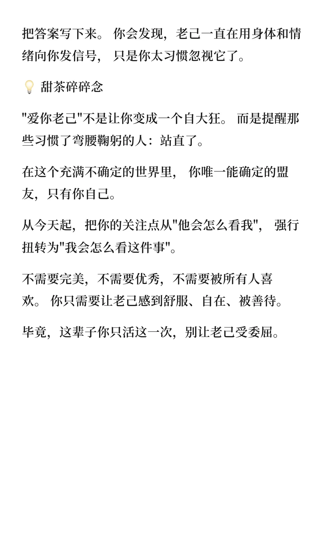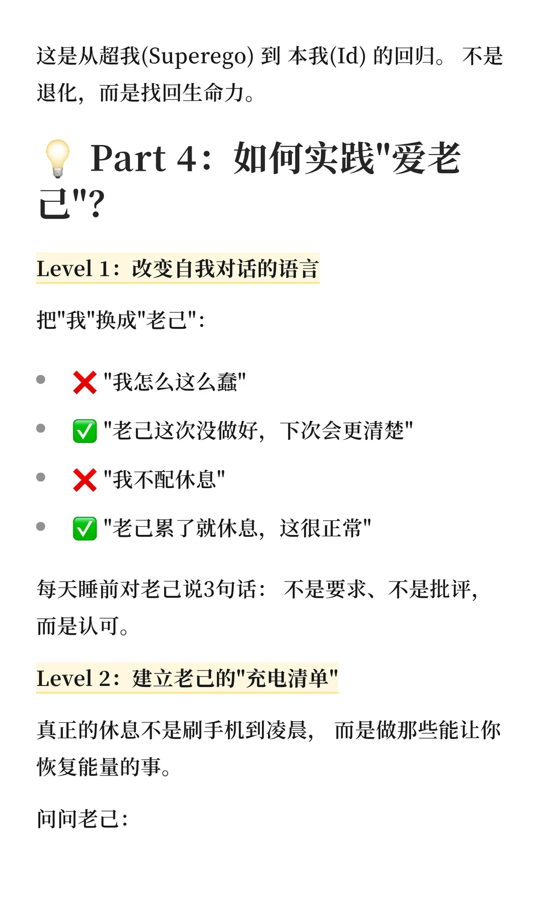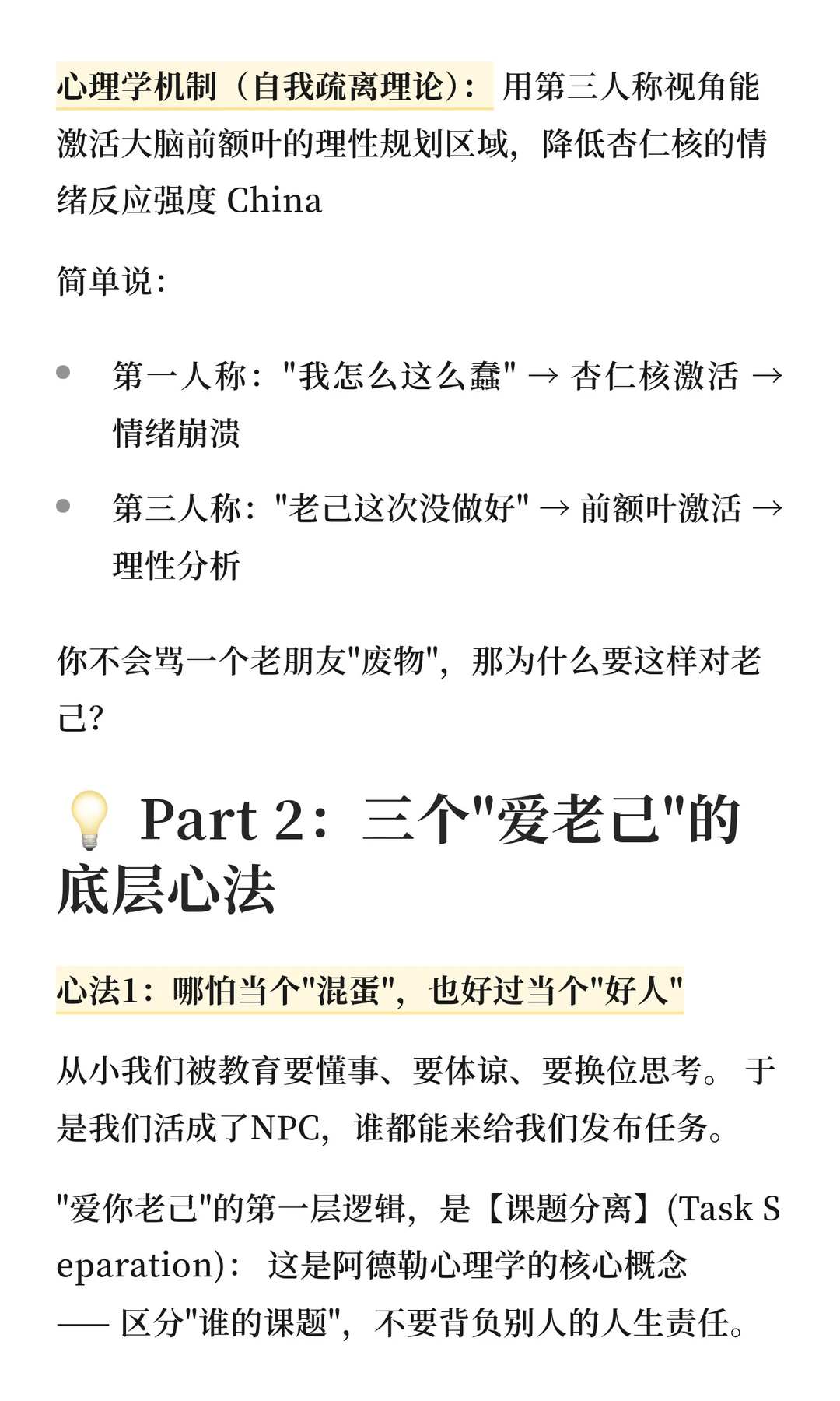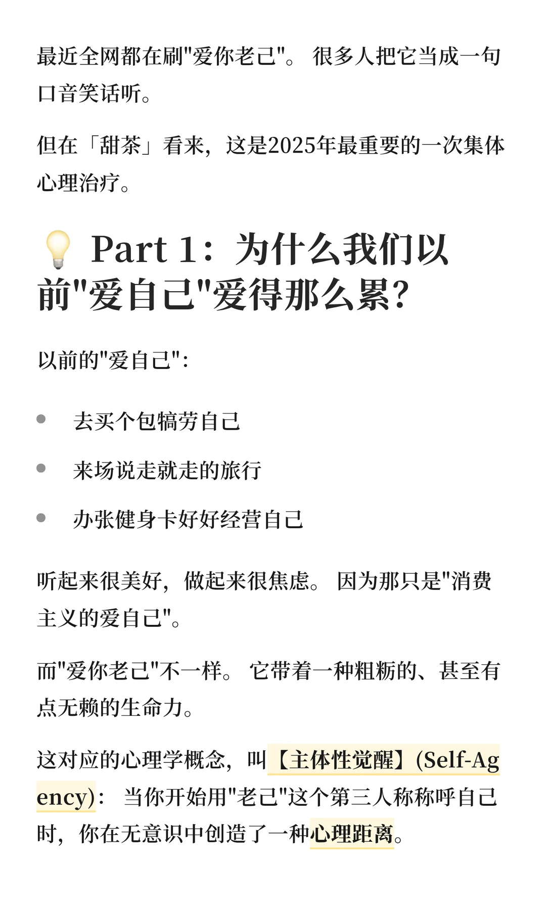 "爱你老己"不是一句烂梗,而是成年人的【主体性觉醒】 最近全网都在刷“爱你老己”。 别只把它当成一句口音笑话听。 在心理学上,这是最顶级的【主体性觉醒】(Self-Agency)。 为什么以前我们“爱自己”爱得那么累? 因为全是KPI:要自律、要变美、要优秀。 而“爱你老己”,带着一种粗粝的、甚至有点无赖 的生命力。 🧠 为什么它能治愈内耗? 这是一种【心理疏离】机制。 你永远不会指着几十年的老朋友骂“废物”,那你为什么要这样骂自己? 当你把“我”换成“老己”时,审视变成了宽容,焦虑变成了接纳。 🛡️ 建议把这3条心法刻进DNA: ▪️课题分离: 你高不高兴是你的事,老己爽不爽是我的事。 ▪️防御性自私: 哪怕当个“混蛋”,也好过当个憋屈的NPC。 ▪️收回神权: 我不需要被任何人点赞,我自己就是这台戏的导演。 从今天起,停止对自己进行微观管理。 在这个不确定的世界里,唯一能确定的盟友,只有你自己。 这辈子你只活这一次,别让老己受委屈。 No.026 心理词条 | 健康的自恋