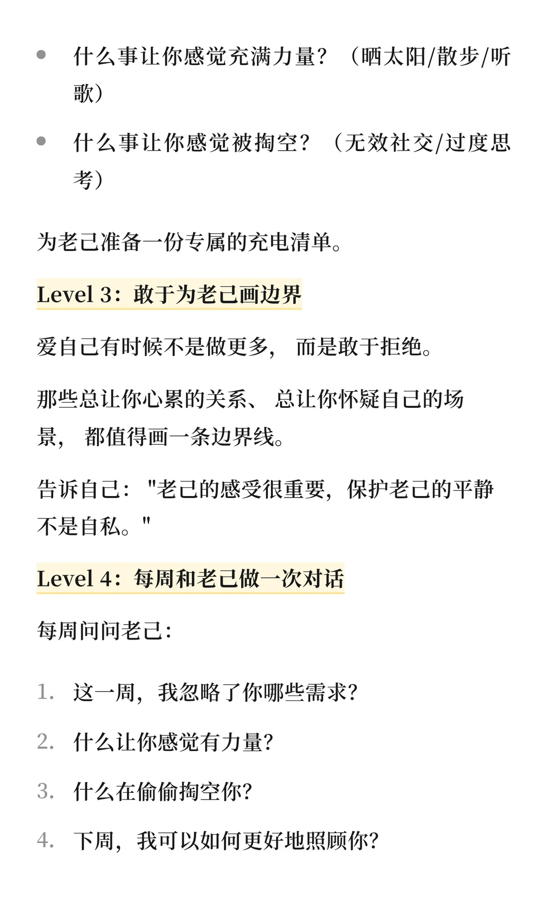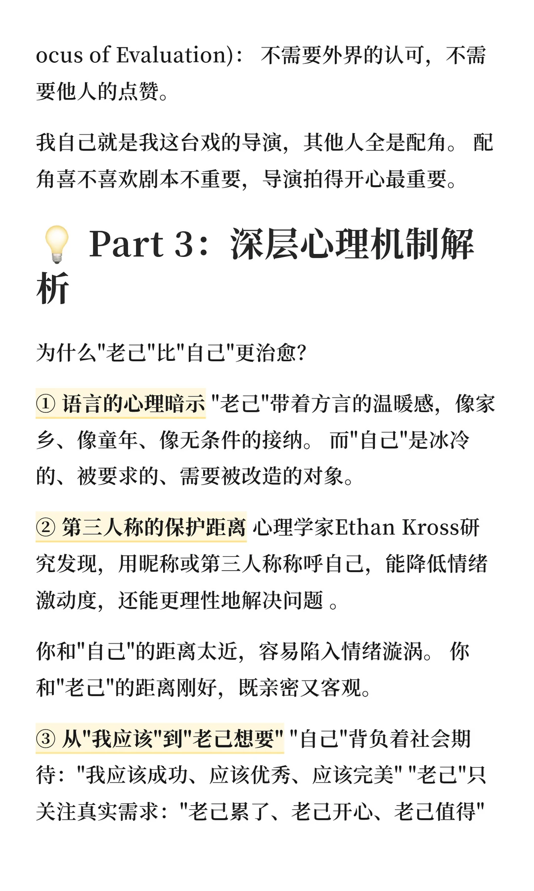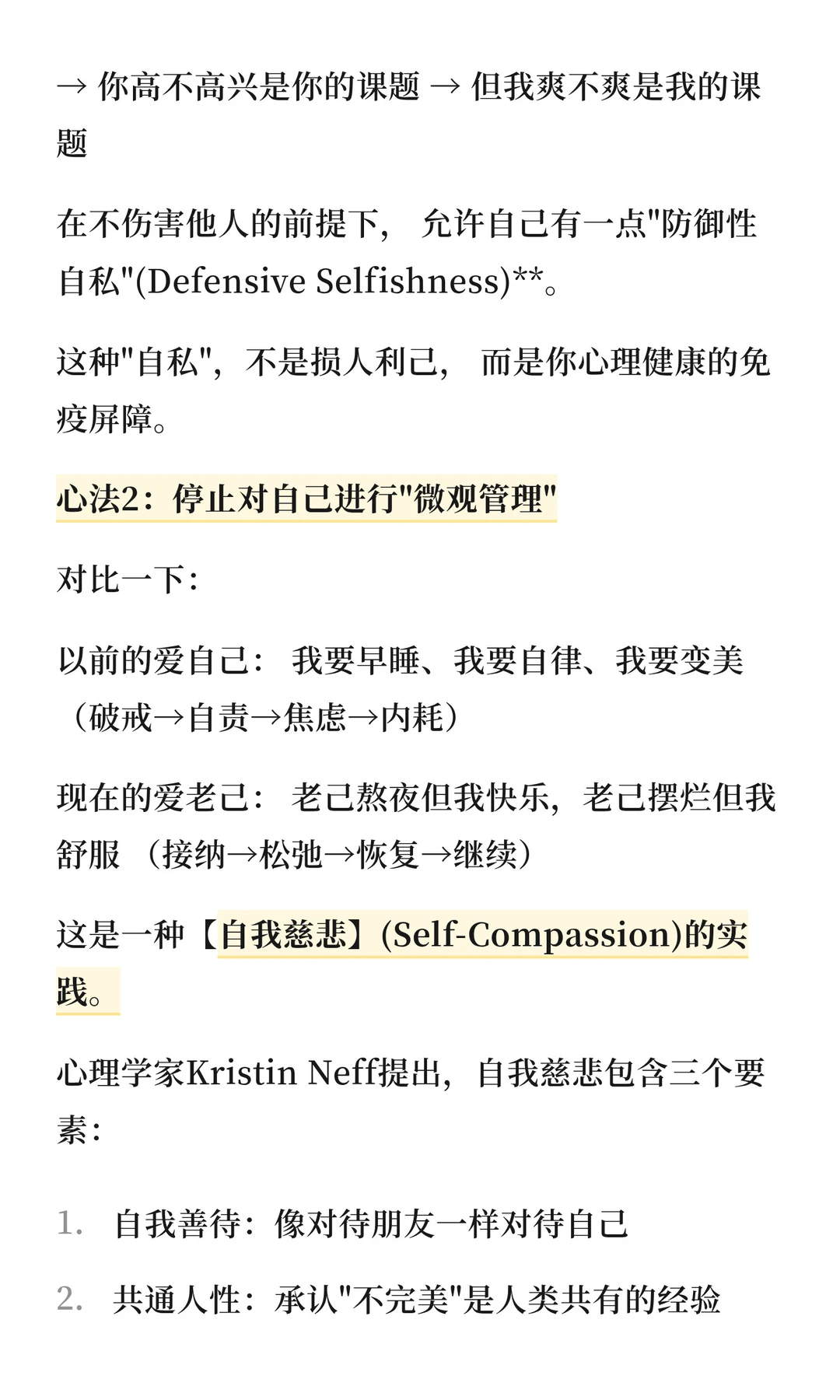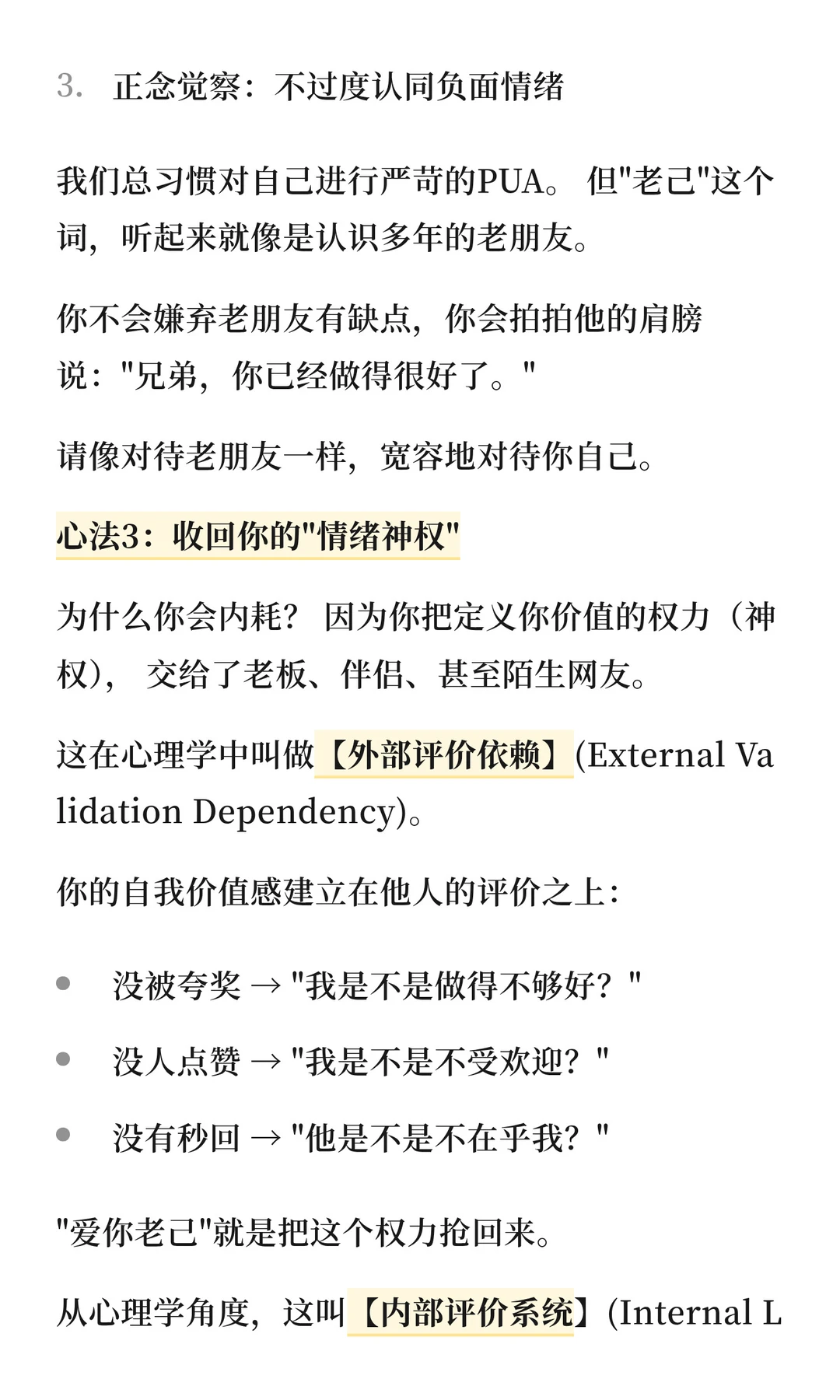 "爱你老己"不是一句烂梗,而是成年人的【主体性觉醒】 最近全网都在刷“爱你老己”。 别只把它当成一句口音笑话听。 在心理学上,这是最顶级的【主体性觉醒】(Self-Agency)。 为什么以前我们“爱自己”爱得那么累? 因为全是KPI:要自律、要变美、要优秀。 而“爱你老己”,带着一种粗粝的、甚至有点无赖 的生命力。 🧠 为什么它能治愈内耗? 这是一种【心理疏离】机制。 你永远不会指着几十年的老朋友骂“废物”,那你为什么要这样骂自己? 当你把“我”换成“老己”时,审视变成了宽容,焦虑变成了接纳。 🛡️ 建议把这3条心法刻进DNA: ▪️课题分离: 你高不高兴是你的事,老己爽不爽是我的事。 ▪️防御性自私: 哪怕当个“混蛋”,也好过当个憋屈的NPC。 ▪️收回神权: 我不需要被任何人点赞,我自己就是这台戏的导演。 从今天起,停止对自己进行微观管理。 在这个不确定的世界里,唯一能确定的盟友,只有你自己。 这辈子你只活这一次,别让老己受委屈。 No.026 心理词条 | 健康的自恋