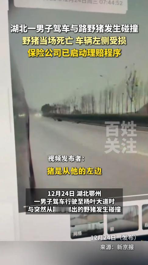 “防不胜防!”12月24日,湖北鄂州,一男子开车行驶在路上时,突然听到车子传出一声巨响,由于不知道撞到了什么,他立即停车查看,看到不远处有个黑乎乎的东西,凑近后发现是头野猪!已经没有呼吸了。交警:司机全责! 这几年,很多地区都有野猪的身影,由于野猪繁殖的速度非常快,再加上冬天食物不好找,有些野猪就会来到城市中“探险”,如果真的遇到了,大家一定不要靠近,因为这家伙可不是好惹的。 当天早上,男子如往常般开车去上班,由于这段路自己经常走,也知道车辆不多,所以他的车速也稍微有些快。 就在车子快速穿梭在马路上时,男子发现左侧突然冲过来一个漆黑的东西,紧接着就听到“嘭”的一声巨响,车子和那东西结结实实的撞在了一起。 男子立即靠边停下车,回去查看撞了个什么东西,这才发现原来是头野猪! 大马路上哪来的野猪?男子虽然纳闷,但还是第一时间报了警并联系保险公司,交警赶来后,对事故进行了责任认定,是男子单方面的责任,好在他有保险,不需要自己掏钱修车了。 网友看后表示,马路上撞到野猪,这种事还真不是谁都能遇到的,不知道是该说男子运气好还是不好,这也提醒司机开车时要及时观察路况,以免发生意外。 信息来源:《男子驾车与横冲野猪碰撞,野猪当场死亡,车辆左侧受损,知情者:野猪当场死亡,人没事。》羊城晚报