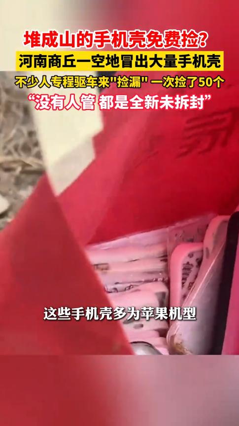 “天上掉馅饼了!”近日,河南商丘,一男子路过村口空地时,发现地上都是全新未拆封的手机壳,包装上还有手机型号!他当即挑选了几个,发现和自己的手机完美适配,不知道为什么会被丢弃在这里?村民:去晚就捡不到了! 为了防止手机被摔坏,很多人买完手机都要再买一个手机壳,用一段时间觉得不好看了,还会更换新的款式,这种花小钱办大事的事情,很多人都觉得很值得。 据媒体12月25日的报道,当时有村民看到村头的一处洼地里,堆满了型号各异的手机壳,不知道是谁扔在这里的,还是先存放在此的,但是此后一直没有人过来拉走。 这些手机壳的款式都很新,而且包装也没有被打开,没有人知道为什么会被丢在这里。 随着事情逐渐传来,周围的村民纷纷过来寻找适合自己的手机壳,到了后面,甚至还有人专门驱车过来捡手机壳,大家都拿着袋子,有的人捡一两个就走,有的人甚至捡了几十个,毕竟来都来了,不多拿几个也是浪费。 但至于这些手机壳的来历,周围的村民也不知情,有关部门也正在调查中。 网友看后猜测,会不会是工厂的残次品,或者检测出这批产品质量不达标,处理起来又比较麻烦,所以直接拉出来丢掉了。 大家觉得会是什么原因呢? 信息来源:《河南商丘一空地冒出大量全新手机壳,现场无人看管 有人专程驱车前往,现场市民:捡了50个 大多适配苹果机型,款式很多 也不是旧款》潮新闻