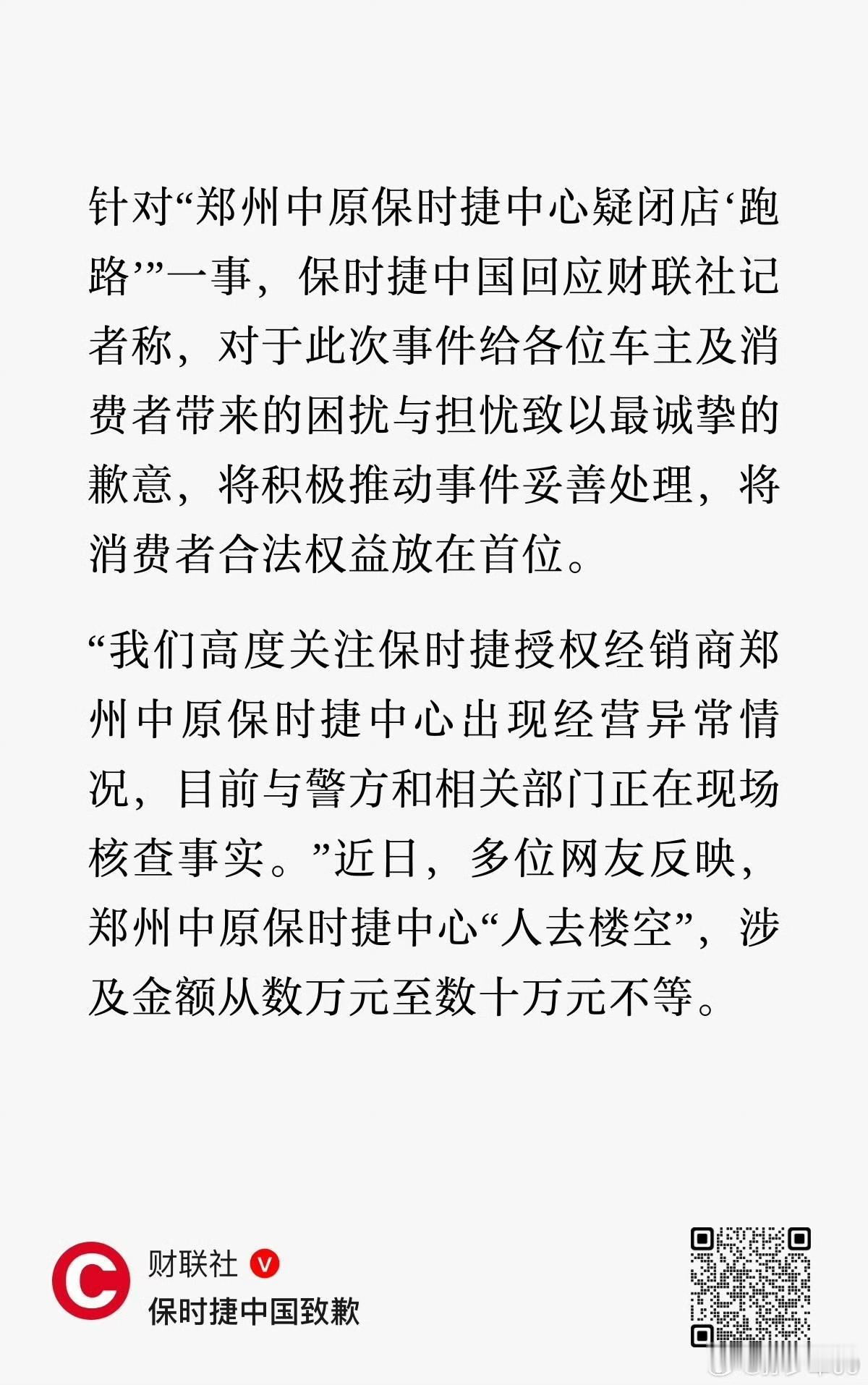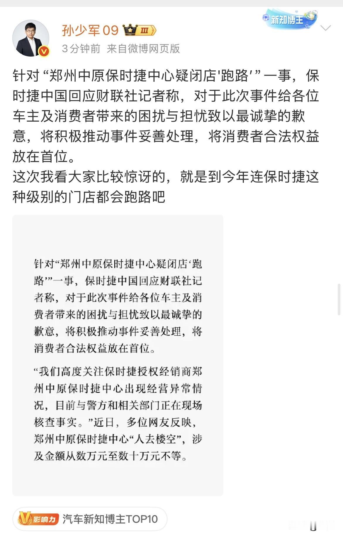 孙少军:针对“郑州中原保时捷中心疑闭店'跑路’”一事,保时捷中国致歉! 就在