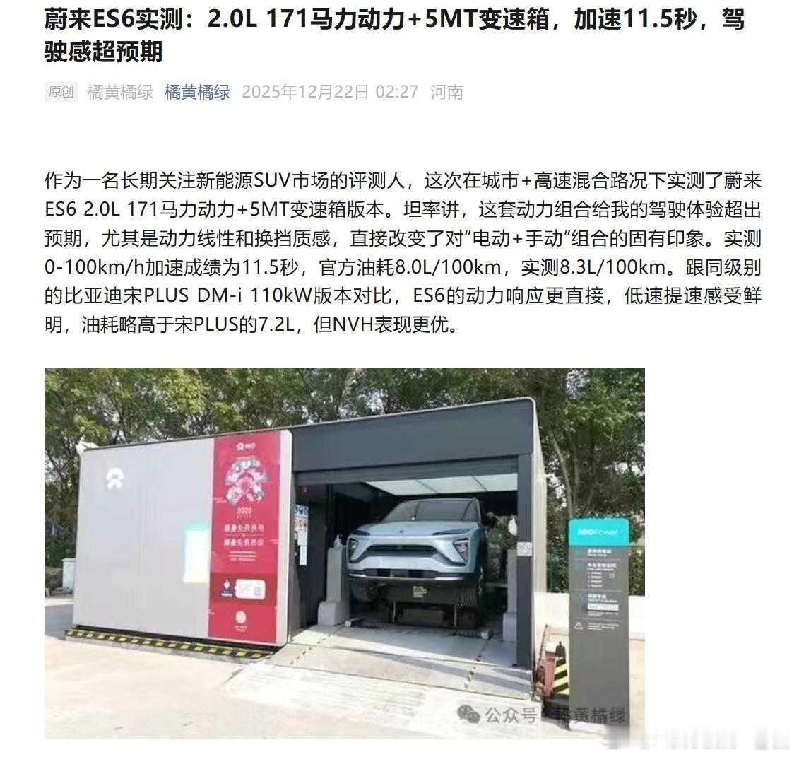 长期关注新能源评测人评测车型蔚来ES6 2.0L 171马力动力+5MT变速箱版本跟同级别的比亚迪宋PLUS DM-i 110kW版本相比简直是魔幻世界了蔚来