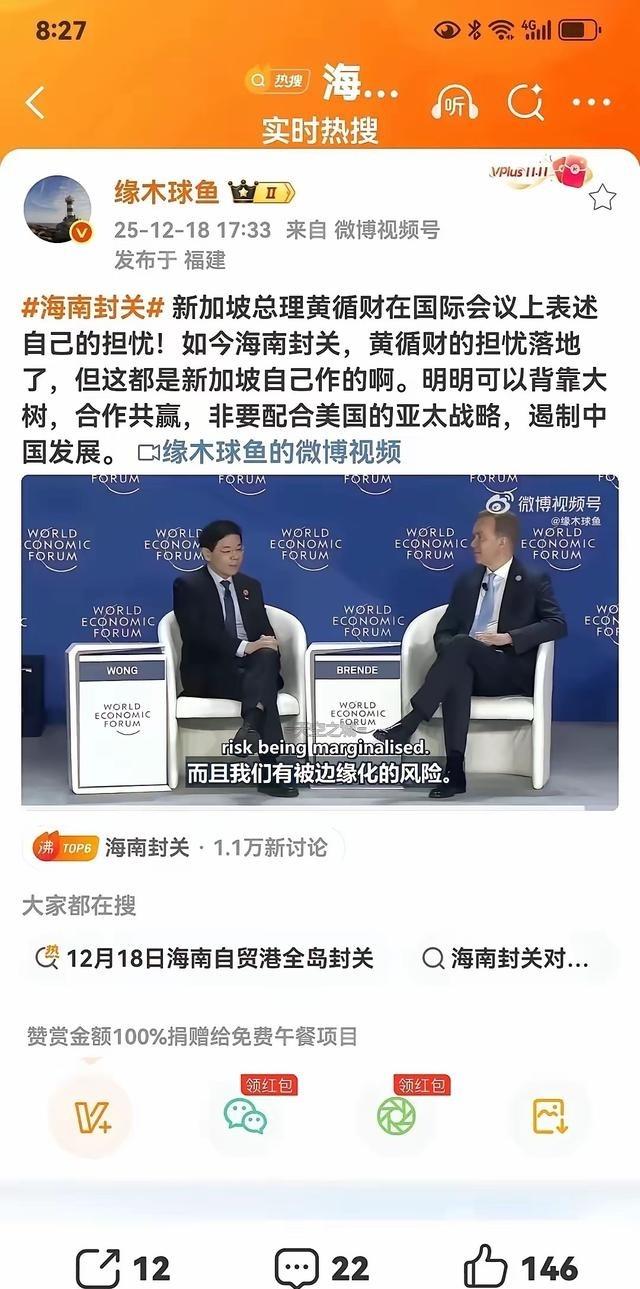 海南岛封关,中国的阳谋,新加坡坐拥马六甲海峡的优势被拆解。想想看,新加坡这个弹丸之地,几十年来靠马六甲海峡的地理位置吃香喝辣,成了全球贸易枢纽。可中国海南岛突然封关,零关税政策一出,直接瞄准转口贸易和金融服务,这会不会让新加坡的饭碗砸了?优势还能撑多久? 新加坡的繁荣基础在于马六甲海峡这个黄金位置。全球贸易船只经过这里,必须停靠加油、维修、转货。新加坡港提供高效服务,收取费用,顺带发展金融结算和物流。结果成了国际金融中心,人均GDP冲到世界前列。外交策略聪明,靠美国撑腰,在中美间摇摆,保持中立捞好处。几十年来,这种模式让新加坡富得流油。可最近,新总理黄循财公开拉偏架,偏向一方,显示出对变化的担心。海南封关一落地,情况就不一样了。 海南全岛封关从2025年12月18日启动,采用一线放开二线管住的模式。境外商品进岛零关税,范围扩大到6600多项,从科研设备到水果奢侈品全覆盖。洋浦港作为重点,承接东南亚和中国西南贸易。船只不用过马六甲,直接到海南中转,节省时间成本。加工增值超30%就能免税进内地市场。这政策直接吸引全球资源,贸易额几年内翻倍。相比新加坡,海南面积大50倍,成本低,靠近大市场。结果,转口贸易开始分流,货物直奔洋浦。 这种变化对新加坡的冲击是结构性的。马六甲海峡虽免费通行,但新加坡靠服务赚钱。现在,海南的零关税和高效物流抢走生意。东南亚水果、橡胶等大宗商品,以前经新加坡定价和转运,现在绕道海南。金融业务也受影响,结算转移到更便宜的地方。新加坡的转口贸易份额下降,港口吞吐量波动。海南不光是竞争,还提供新选择,让贸易更注重效率。越南等邻国也感受到压力,但新加坡作为高端枢纽,首当其冲。 海南封关不是要取代新加坡,而是打开新通道。政策红利精准,个人和企业税率低到15%,比新加坡还优惠。油轮船东算账,发现海南加油更划算。全球供应链调整,制造商转向海南建厂。联合国都感叹,亚洲第五小龙要崛起了。新加坡的护城河还在,法治和金融深度强,但面对这种降维打击,得赶紧升级。黄循财在论坛上说,小国没议价权,显示出焦虑。贸易变局下,新加坡的马六甲优势逐步拆解。