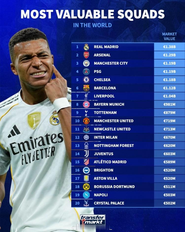 俱乐部德转身价排名:皇家马德里 —— 13.8亿欧阿森纳 —— 12.9亿欧曼城 —— 11.9亿欧巴黎圣日耳曼 —— 11.9亿欧切尔西 —— 11.8亿欧巴塞罗那 —— 11.2亿欧利物浦 —— 10.4亿欧拜仁慕尼黑 —— 9.81亿欧托特纳姆热刺 —— 8.79亿欧曼联 —— 7.19亿欧纽卡斯尔联 —— 7.13亿欧国际米兰 —— 6.70亿欧诺丁汉森林 —— 6.20亿欧尤文图斯 —— 6.03亿欧马德里竞技 —— 5.89亿欧布莱顿 —— 5.20亿欧阿斯顿维拉 —— 5.20亿欧多特蒙德 —— 5.11亿欧那不勒斯 —— 5.03亿欧水晶宫 —— 5.02亿欧