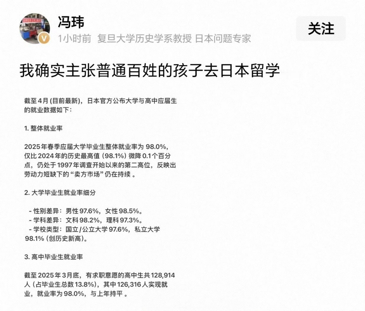 这是冯教授发的帖子,应该是发在外网的。如果是一个跟日本没有任何恩怨的国家,他这样明晃晃地鼓励别人家的孩子到日本留学,是可以的,甚至可以说他很热心、不藏私。但鉴于中日目前这种情况,还鼓励别人家的孩子到日本留学的话,就有点匪夷所思,这是在蠢蠢地害别人。按照冯教授的说法,小孩到日本去留学,然后留在日本工作、建设日本,然后跟到身边和单位的日本人一起对抗自己的母国,因为不对抗就代表失业。