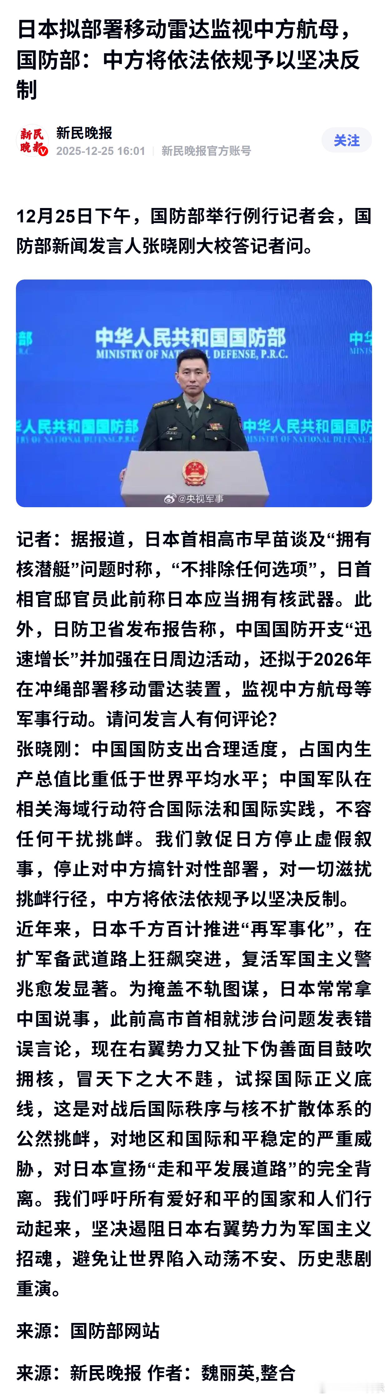 日本拟部署移动雷达监视中方航母,国防部:中方将依法依规予以坚决反制