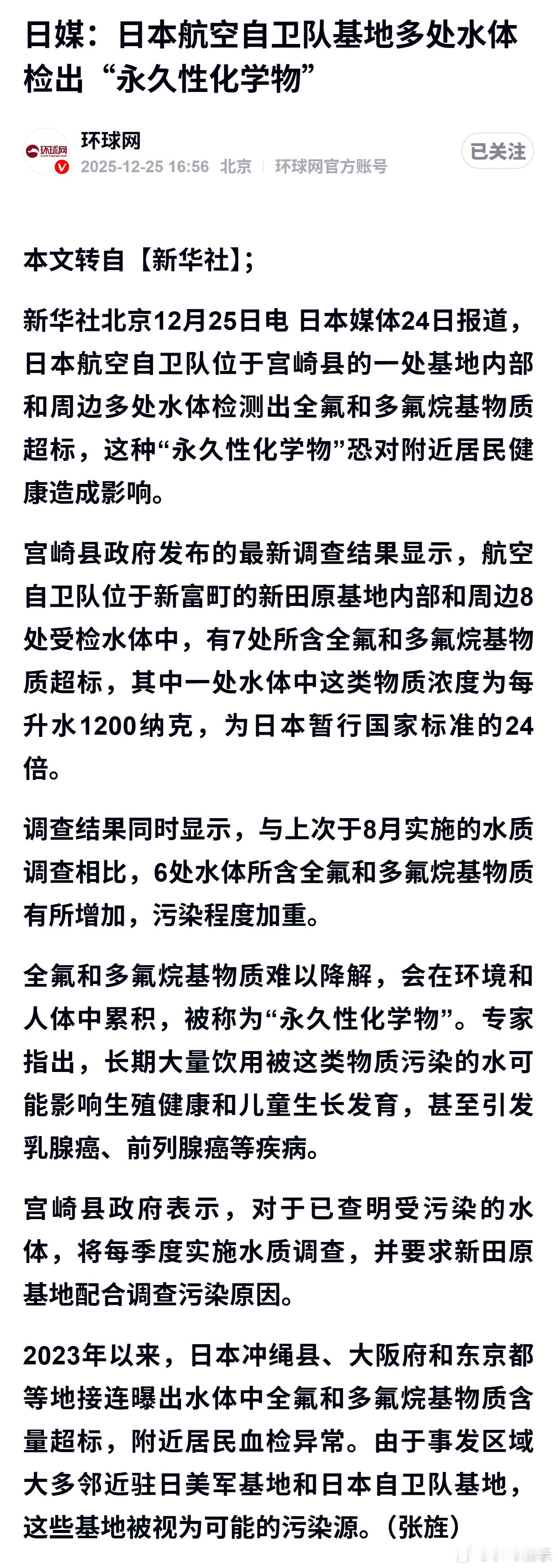 日媒:日本航空自卫队基地多处水体检出“永久性化学物”