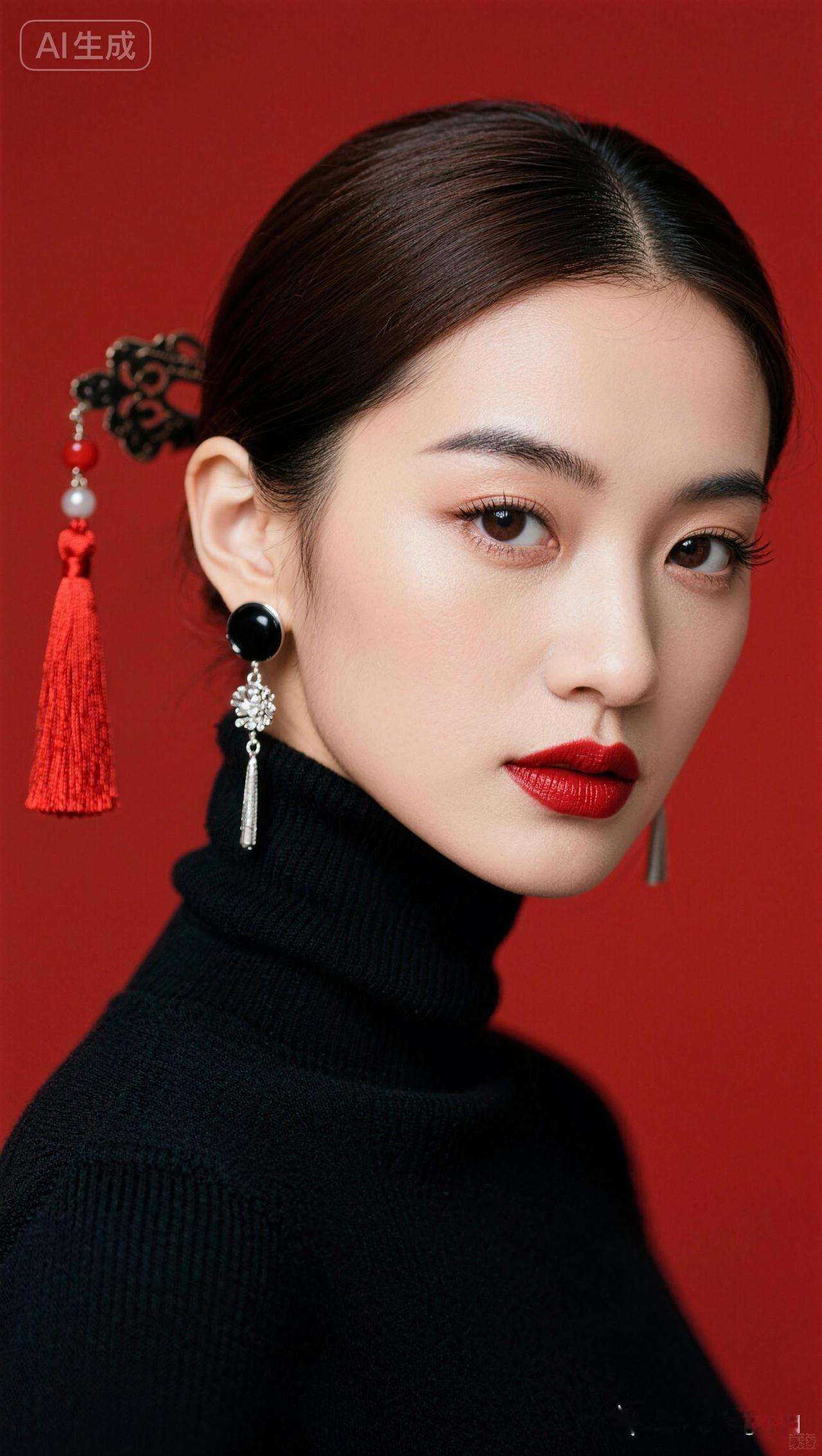 复古红唇与黑色高领毛衣的完美搭配,尽显优雅气质!